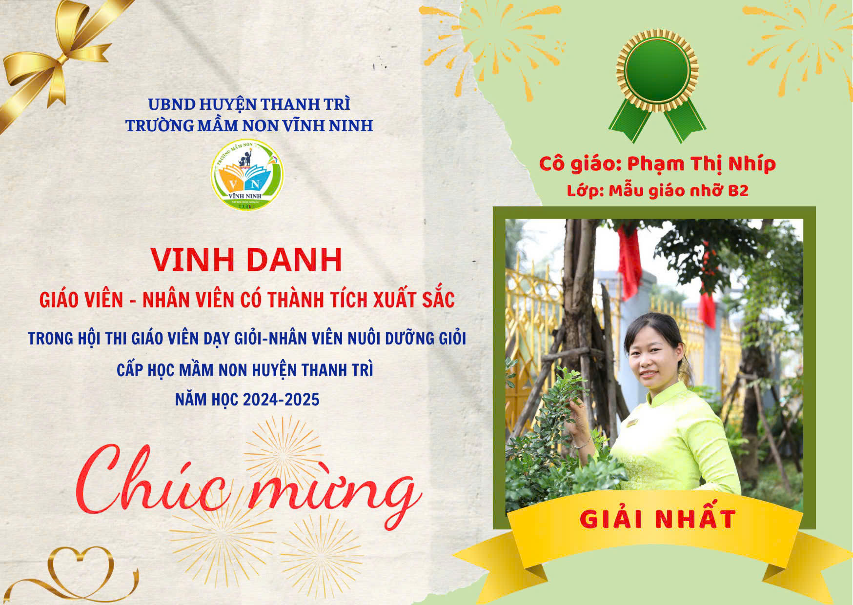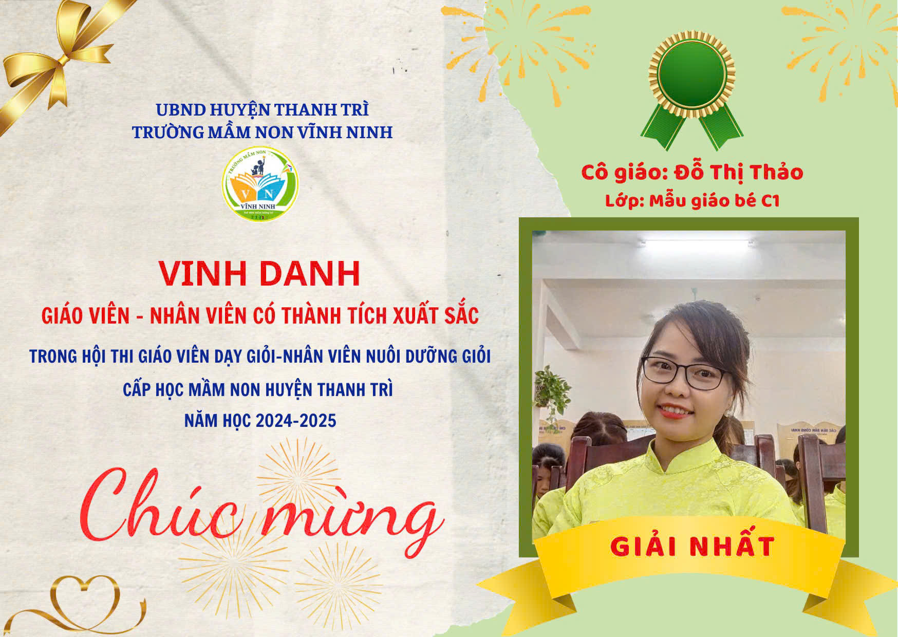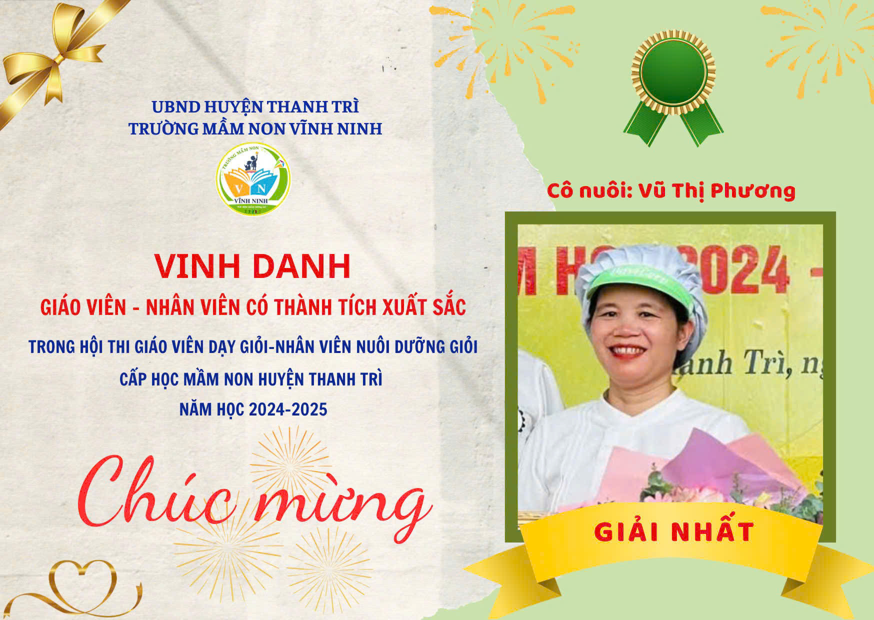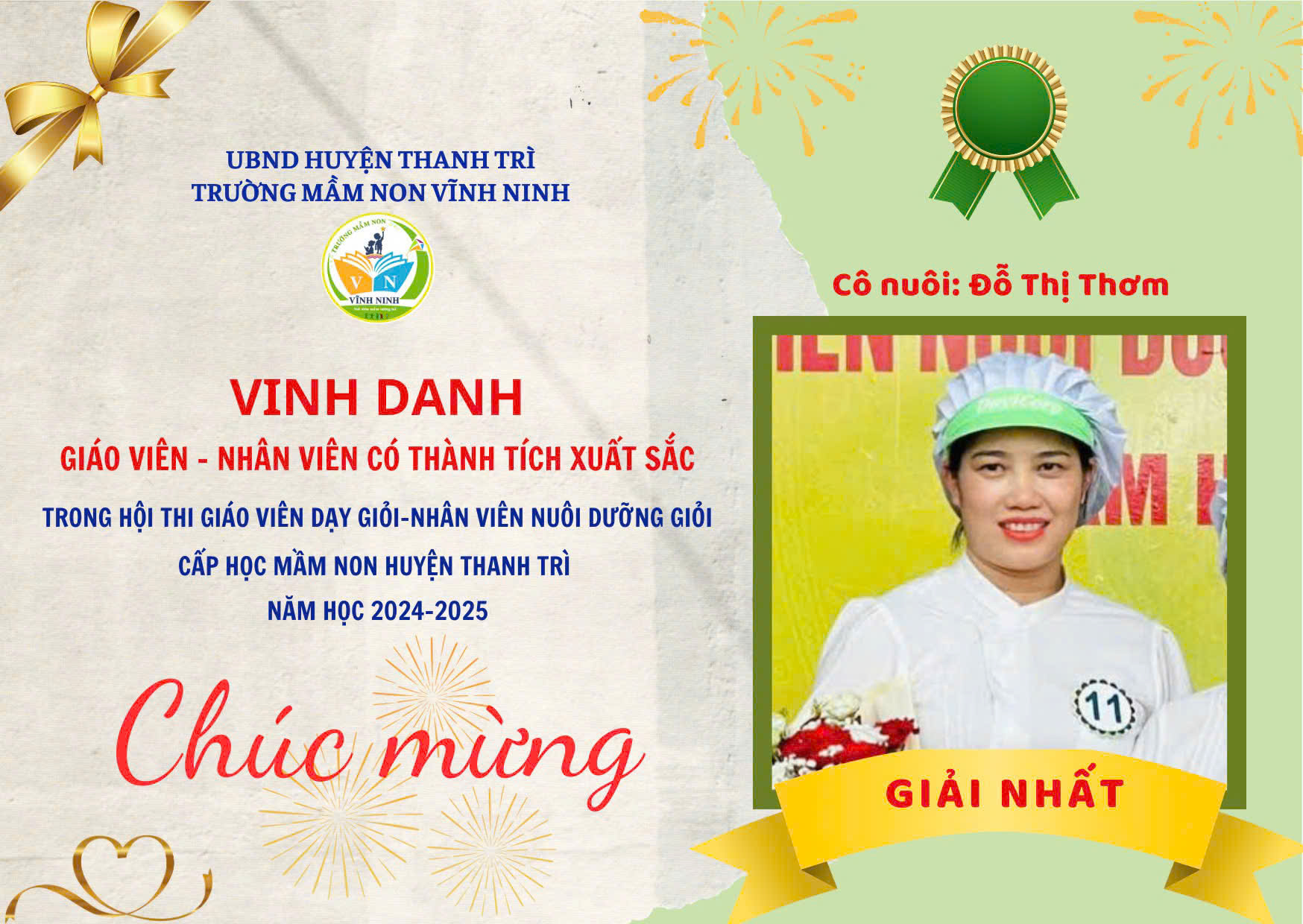 Cùng với đó 02 nhân viên nuôi dưỡng cũng đạt 02 giải Nhất trong Hội thi "Nhân viên nuôi dưỡng giỏi cấp mầm non huyện Thanh Trì năm học 20204-2025" đó là cô nuôi Vũ Thị Phương và cô nuôi Đỗ Thị Thơm