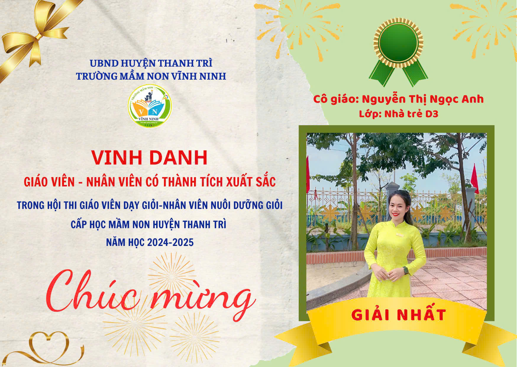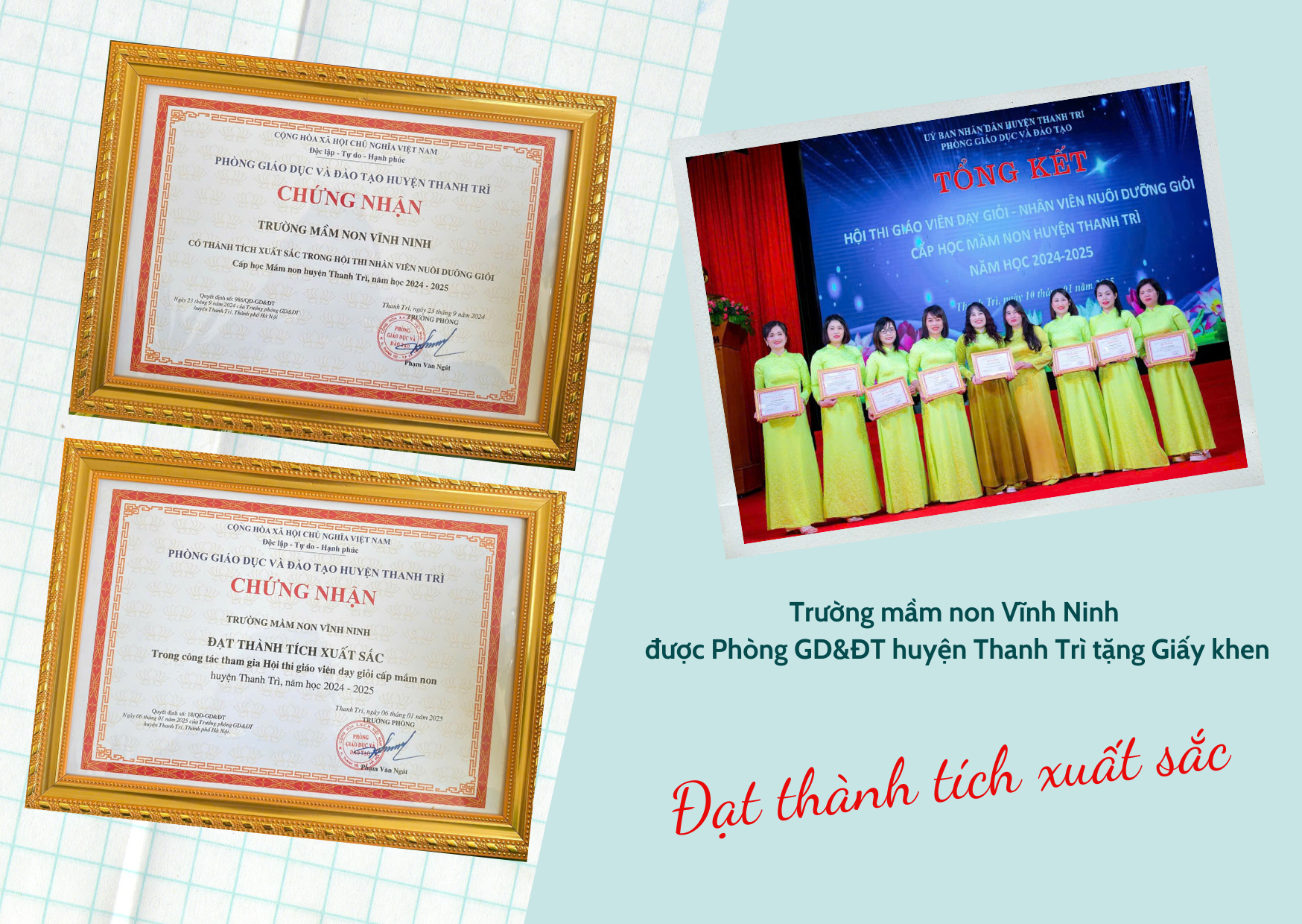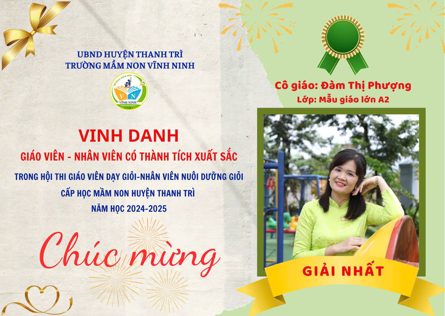 - Đạt thành tích xuất sắc trong công tác tham gia hội thi giáo viên dạy giỏi cấp học mầm huyện Thanh Trì năm học 2024-2025