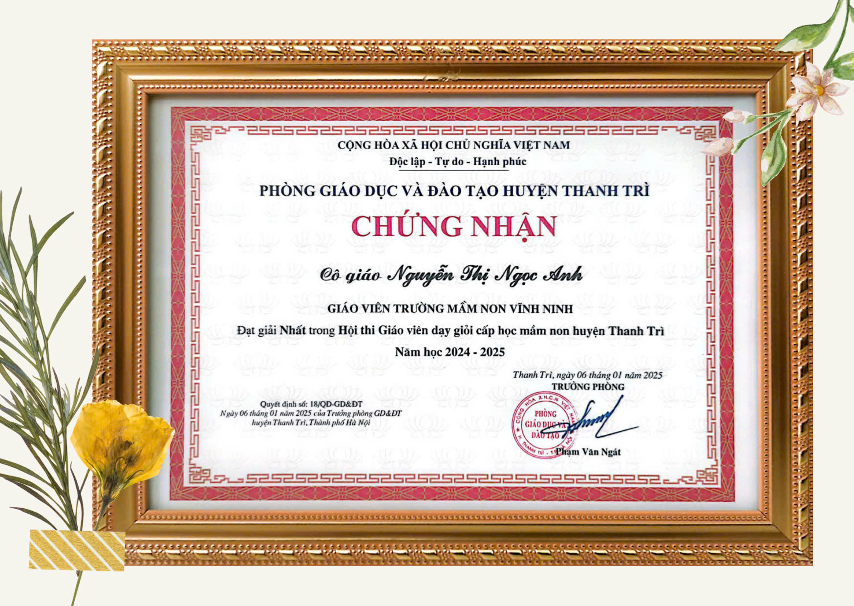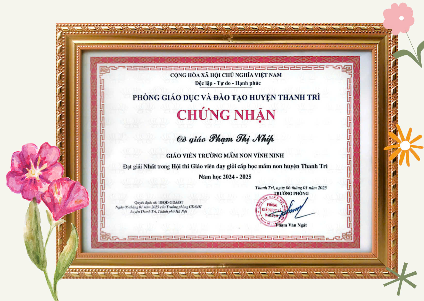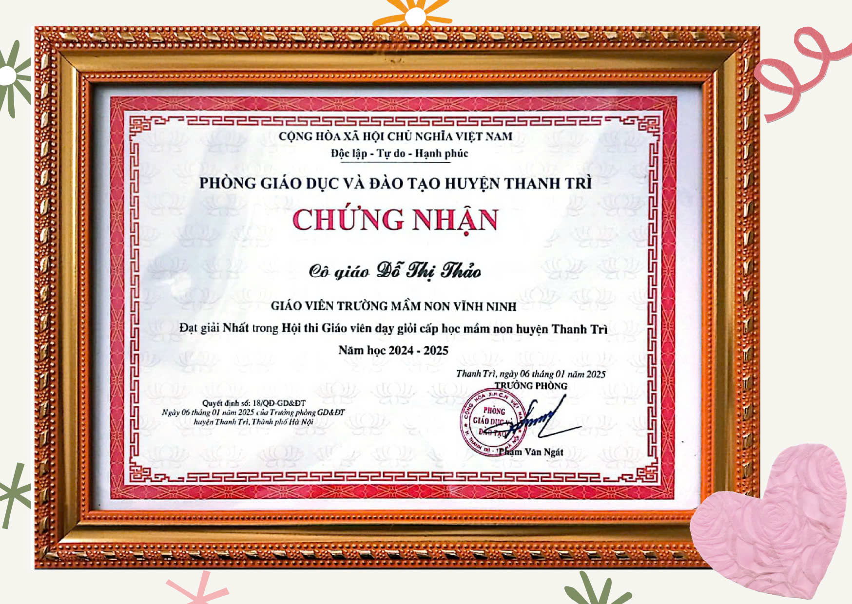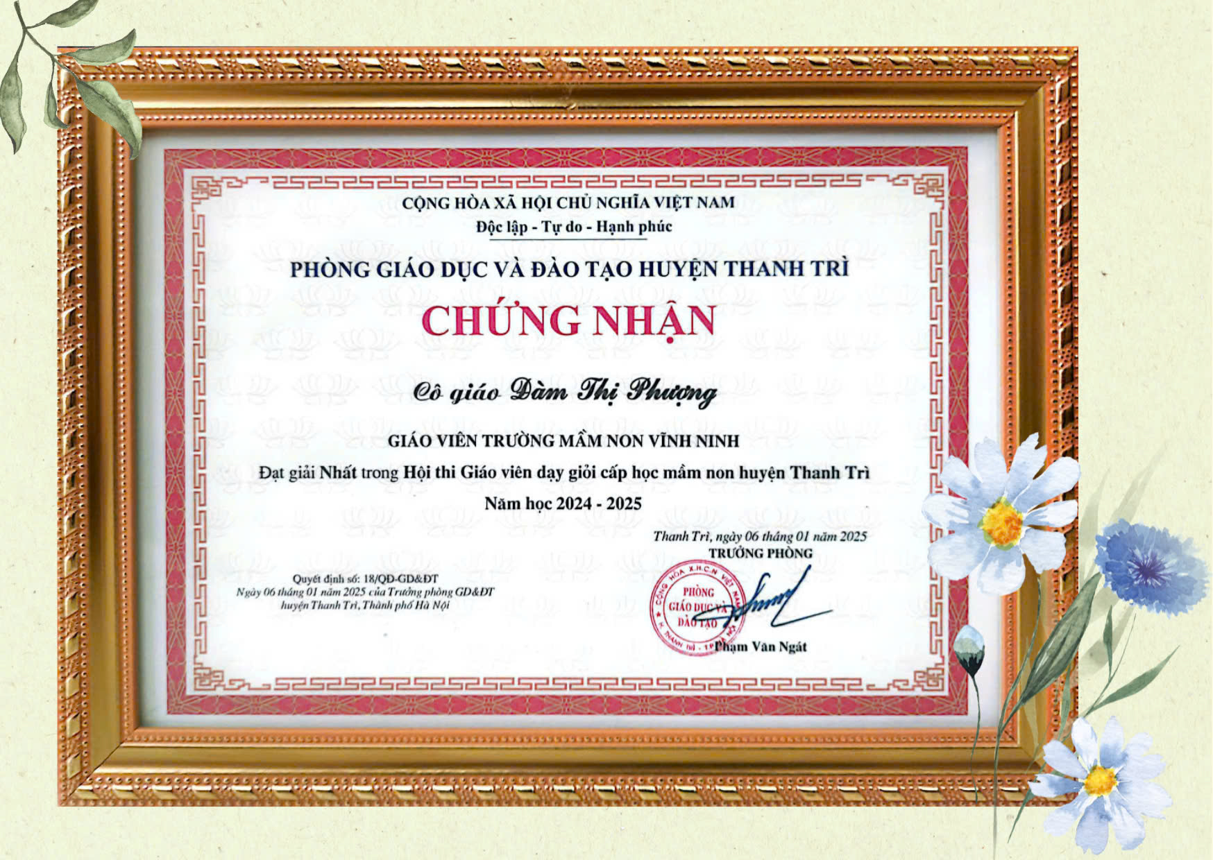 - Đạt thành tích xuất sắc trong công tác tham gia hội thi giáo viên dạy giỏi cấp học mầm huyện Thanh Trì năm học 2024-2025