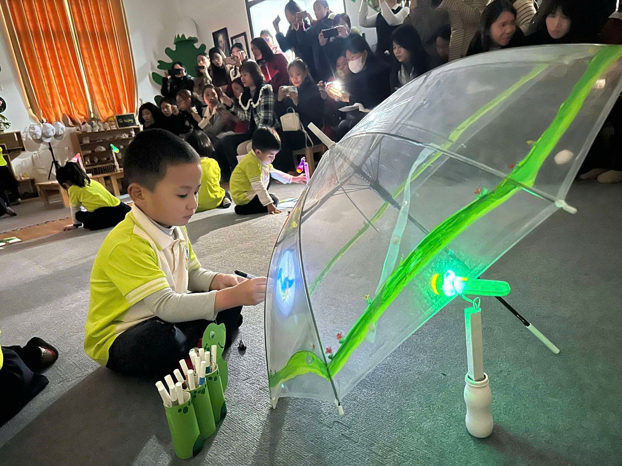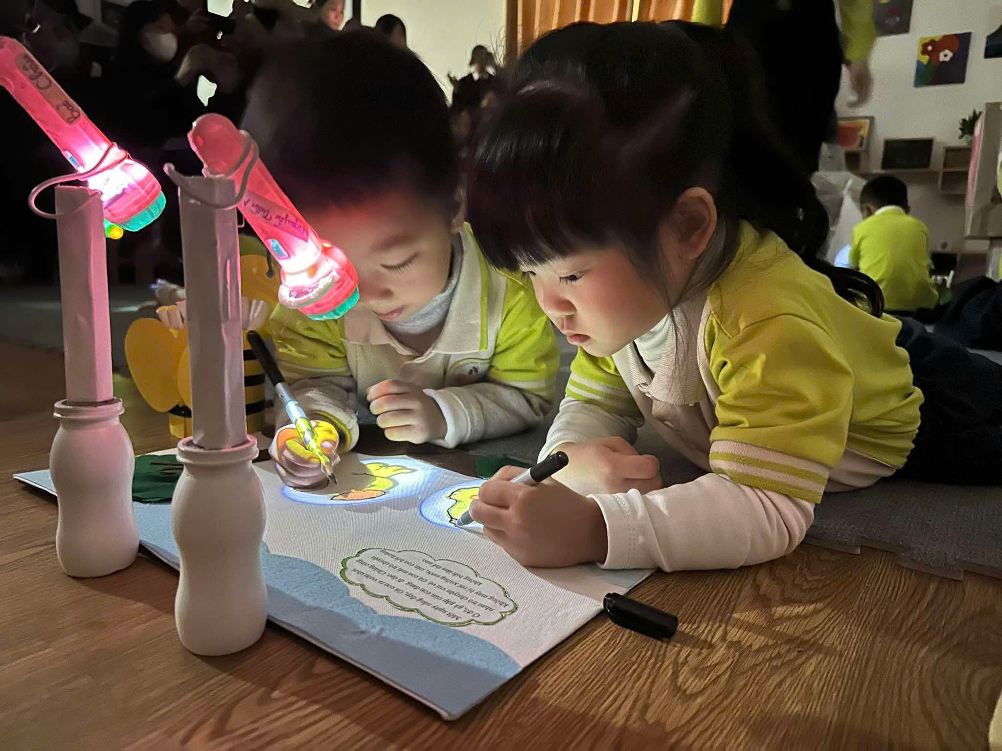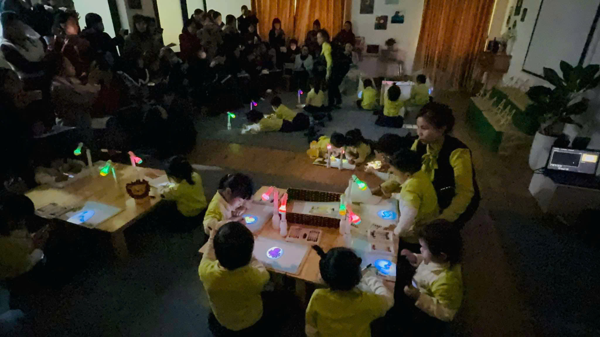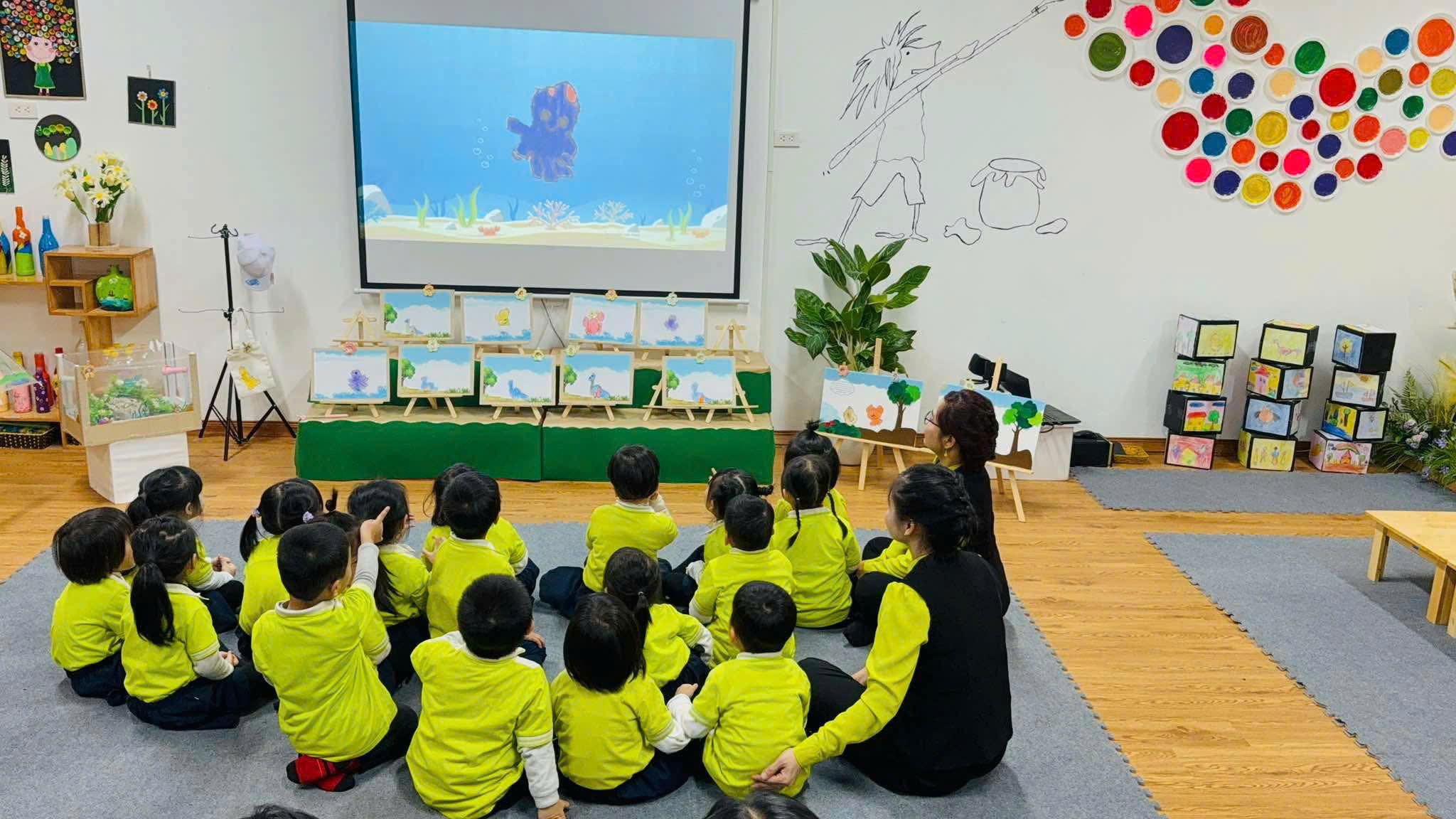 Hoạt động Tạo hình "In bóng con vật bé thích" của cô giáo Đỗ Thị Thảo - được tổ chức tại phòng Nghệ thuật tạo hình của nhà trường. Với chiếc Đèn chiếu 3D là một loại đồ chơi rất gần gũi của trẻ, cô giáo đã sáng tạo biến nó thành một đồ dùng dạy học, cho trẻ in bóng các con vật xuất hiện trong đèn chiếu trên các chất liệu khác nhau như giấy, vải, nilong… Biến việc học của trẻ thành một trò chơi thú vị, giúp trẻ tập trung và dễ tiếp thu kiến thức hơn. Bên cạnh đó cô giáo rất linh hoạt trong việc ứng dụng công nghệ thông tin, lồng ghép trò chơi ứng dụng công nghệ giúp trẻ nhớ lại những kiến thức đã tiếp thu được. Đặc biệt, những con vật đáng yêu của trẻ tạo ra bằng cách in bóng từ đèn chiếu 3D đã được cô giáo sử dụng phần mềm công nghệ số biến thành một bộ phim hoạt hình. Trẻ vô cùng thích thú khi được xem bộ phim hoạt hình với các nhân vật do chính trẻ tạo ra.