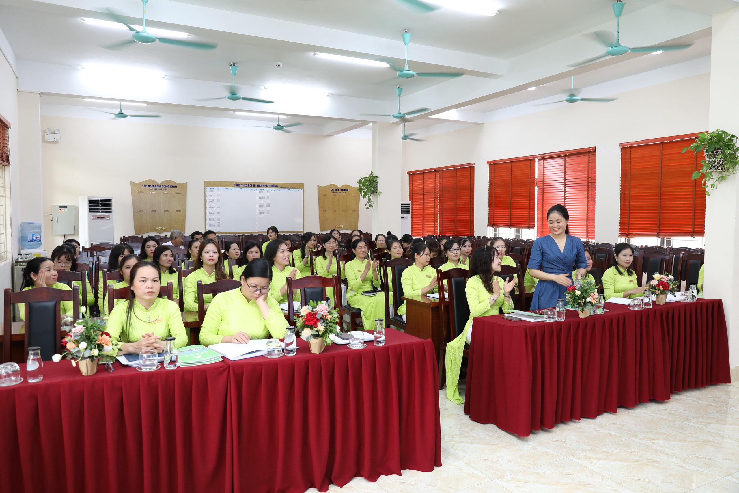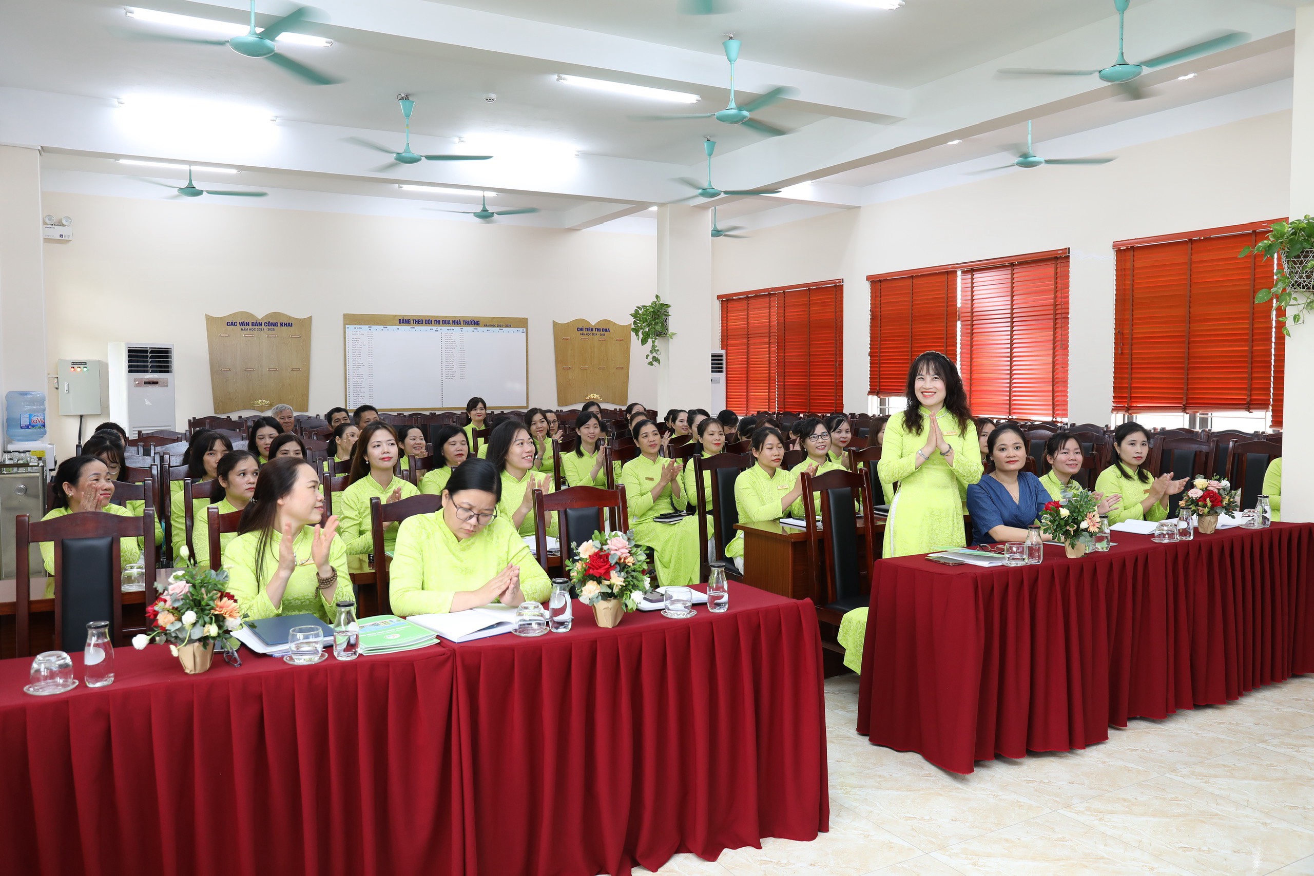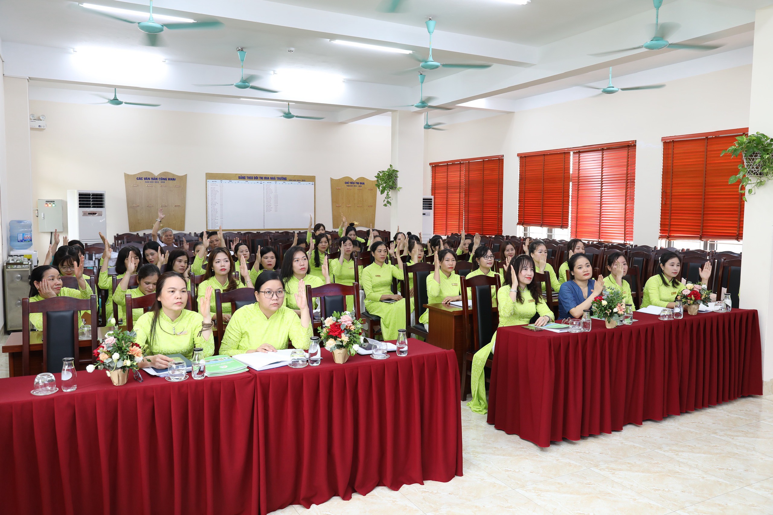100% CB-GV-NV nhà trường đồng lòng nhất trí với các bản dự thảo kế hoạch năm học, qui chế dân chủ, qui chế chi tiêu nội bộ và nghị quyết... được thông qua tại hội nghị.
