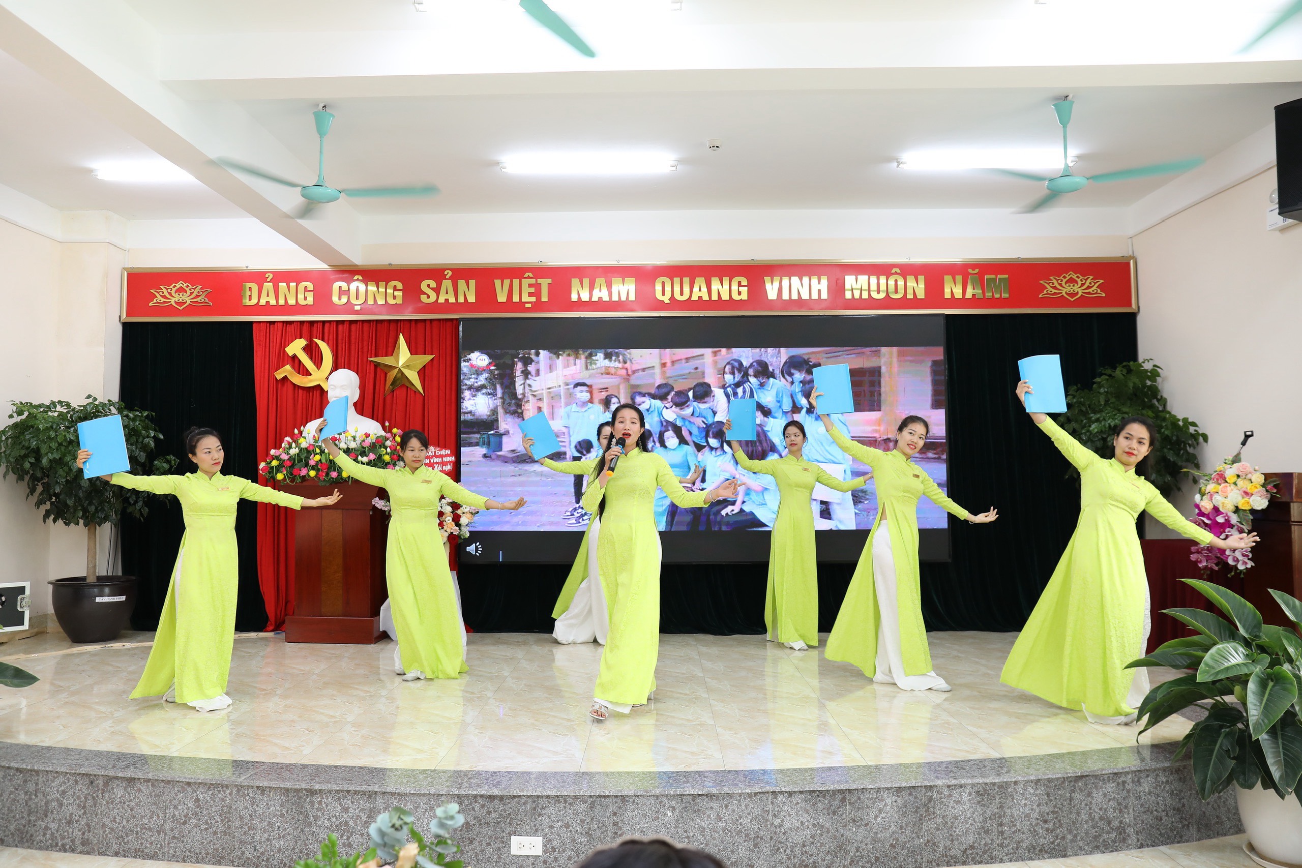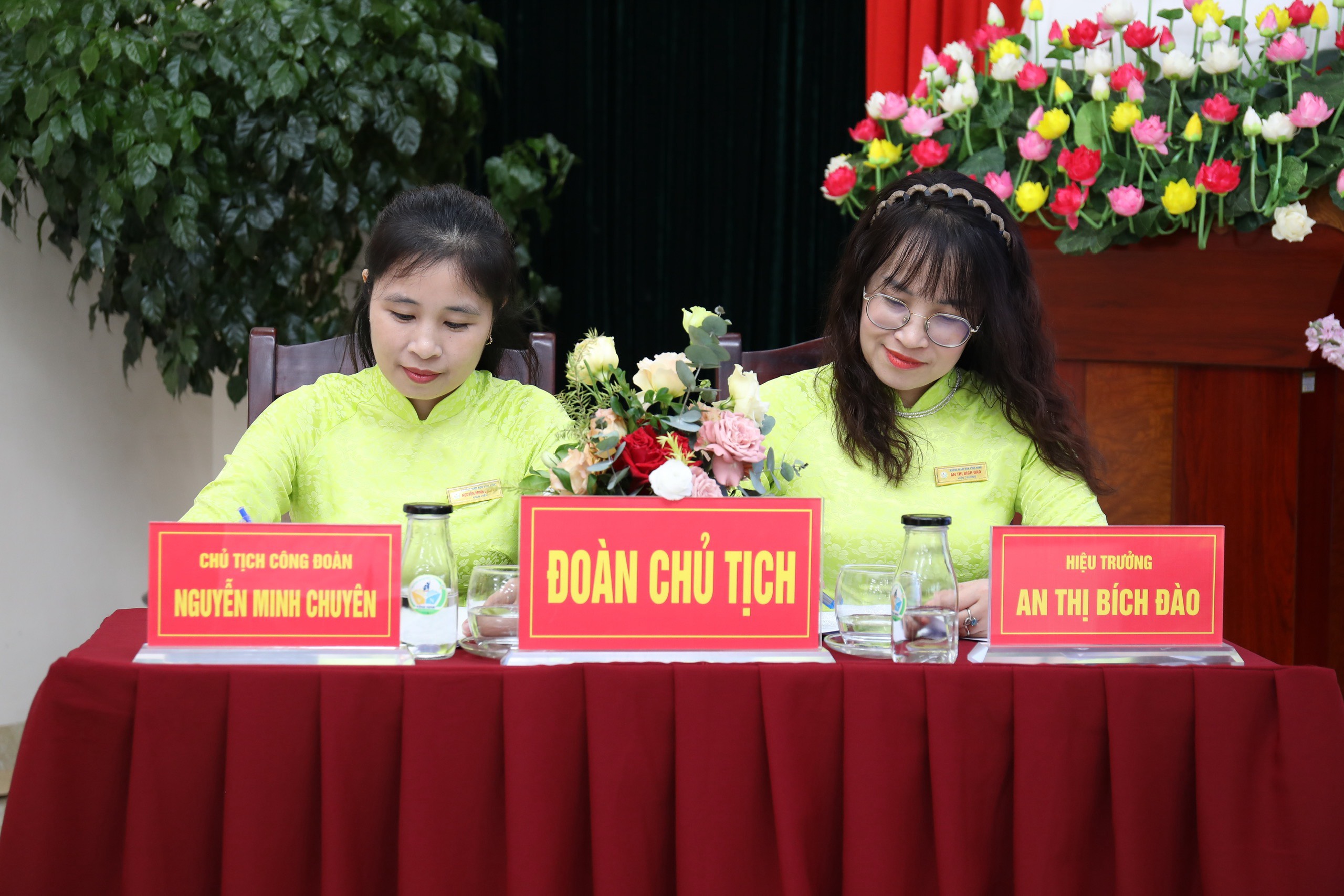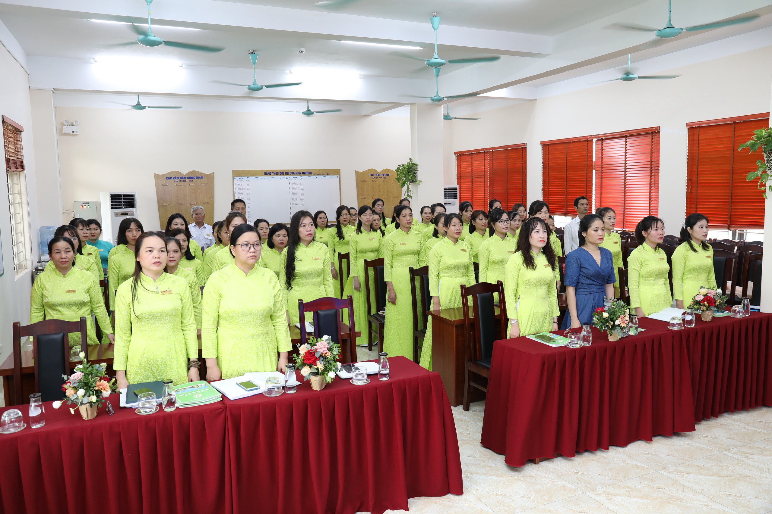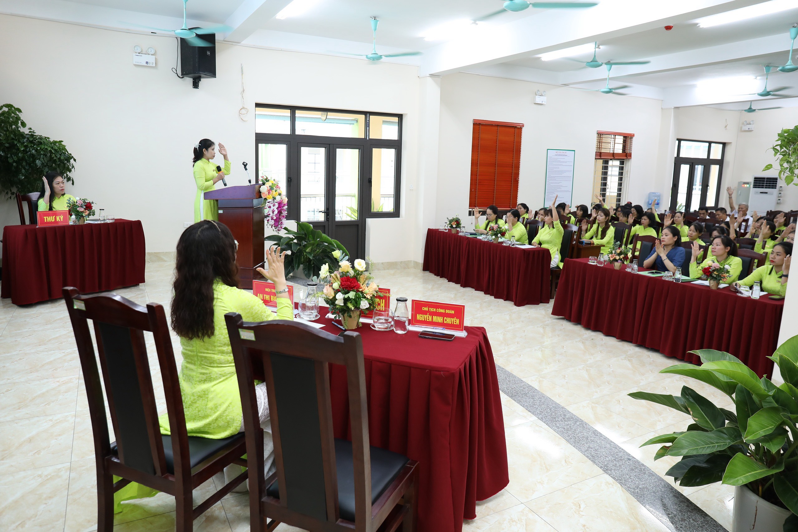 100% CB-GV-NV nhà trường đồng lòng nhất trí với các bản dự thảo kế hoạch năm học, qui chế dân chủ, qui chế chi tiêu nội bộ và nghị quyết... được thông qua tại hội nghị.