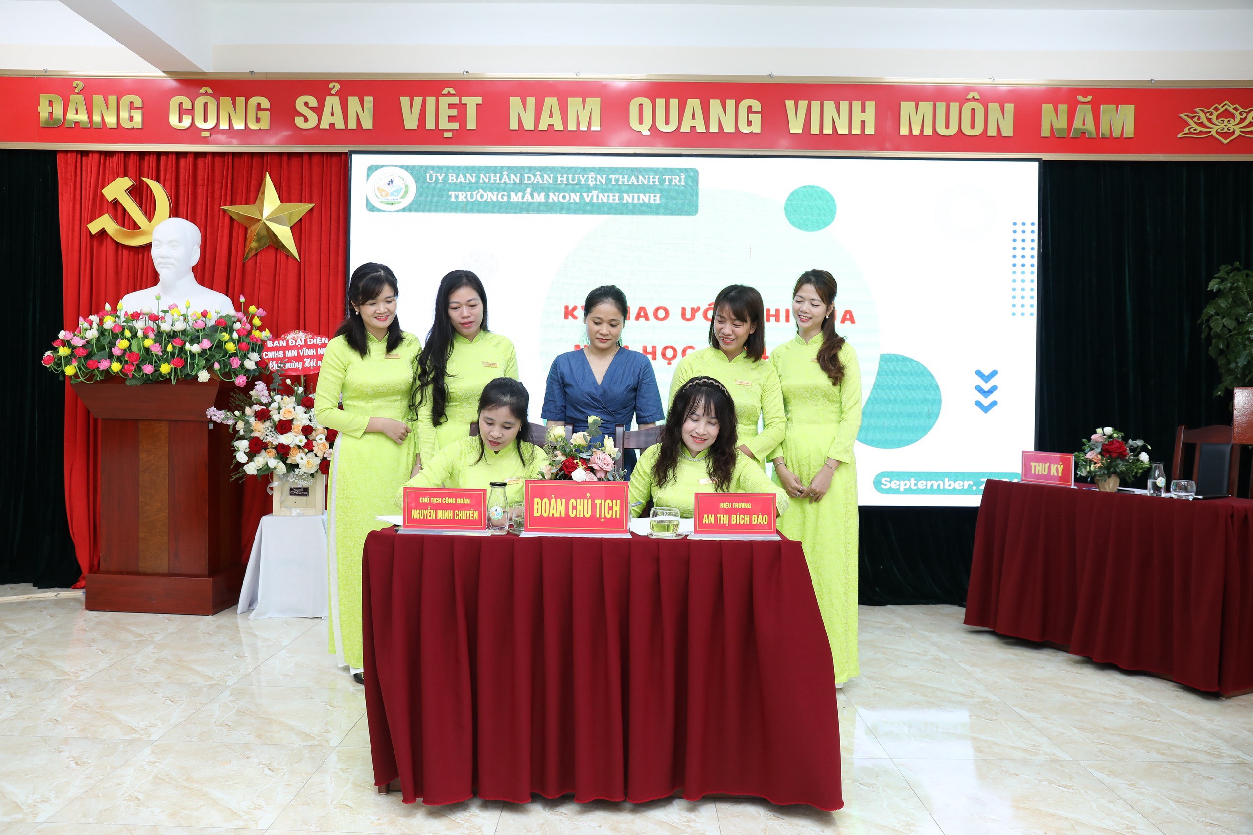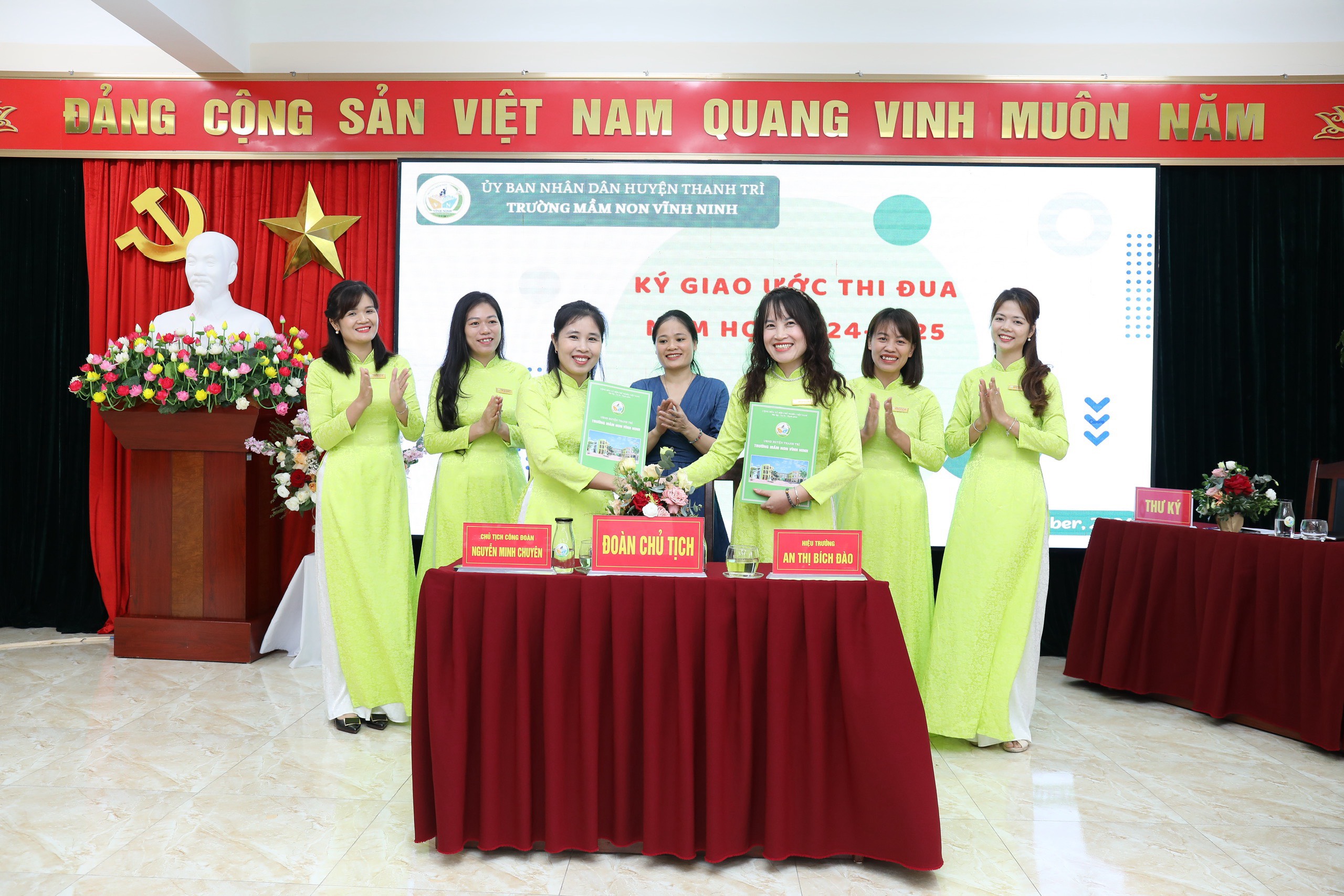 Đồng chí Nguyễn Minh Chuyên - Chủ tịch công đoàn đã phát động phong trào thi đua năm học 2024 -2025; động viên cả tập thể quyết tâm vượt khó thực hiện tốt các phong trào thi đua, nỗ lực hết mình bằng sự tâm huyết, trách nhiệm, sáng tạo để hoàn thành sứ mệnh chăm sóc, nuôi dưỡng, giáo dục trẻ. Tập thể đội ngũ chứng kiến đ/c Hiệu trưởng và đ/c Chủ tịch công đoàn ký giao ước thi đua giữa Ban giám hiệu và Ban chấp hành công đoàn năm học 2024 - 2025.