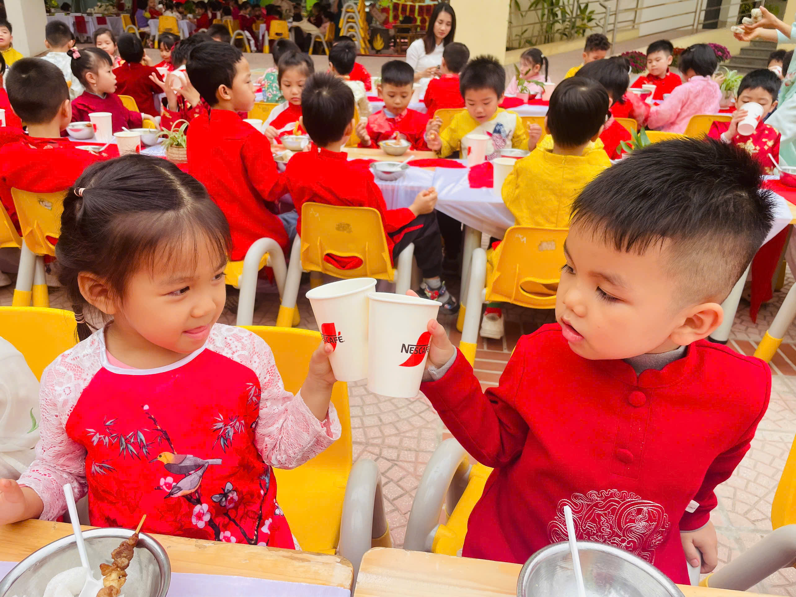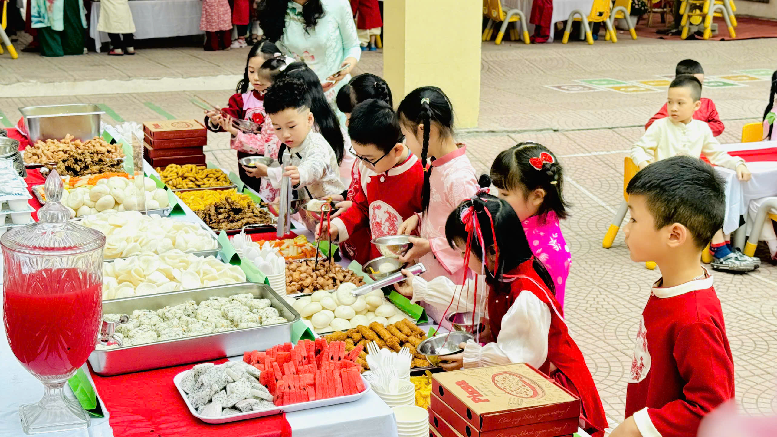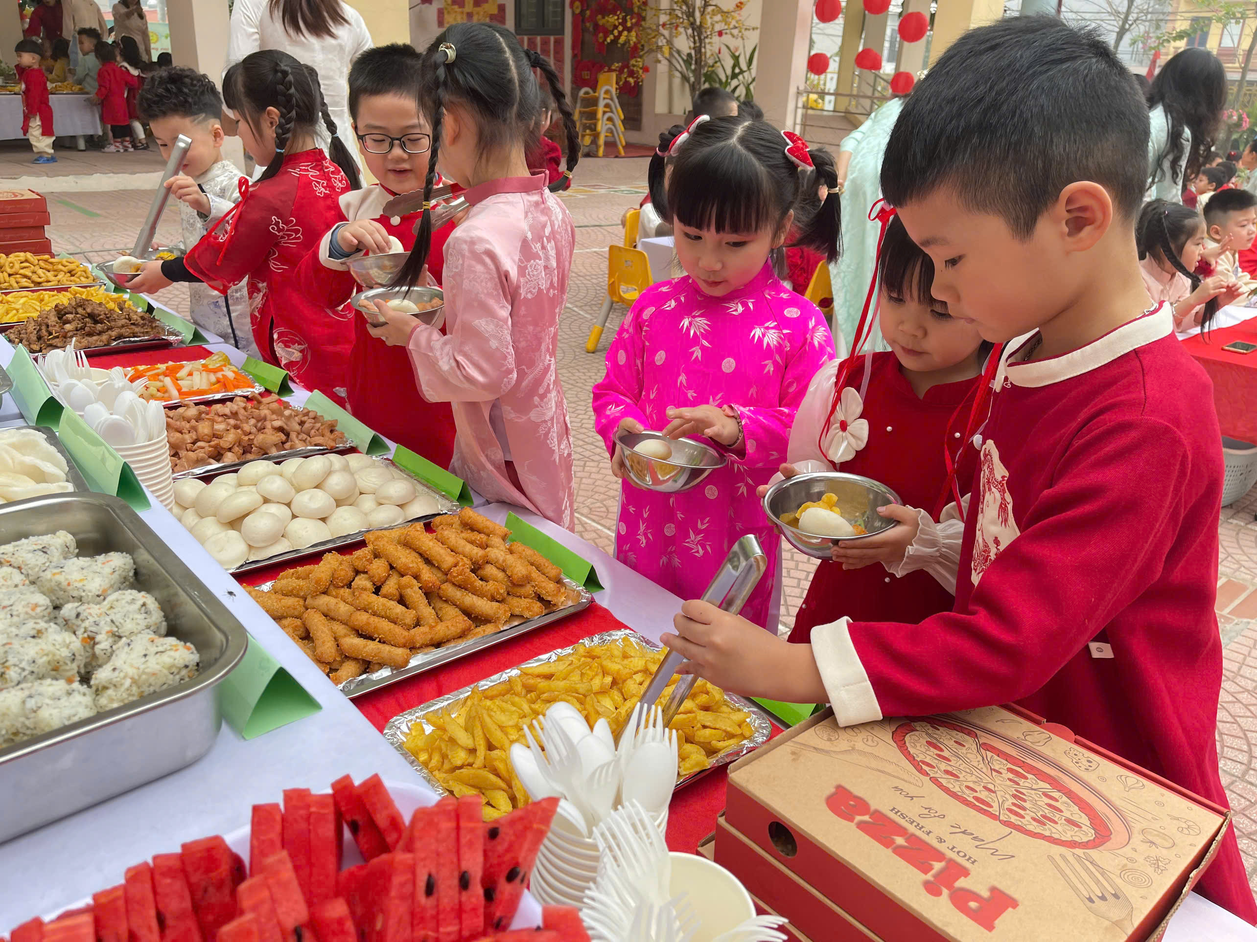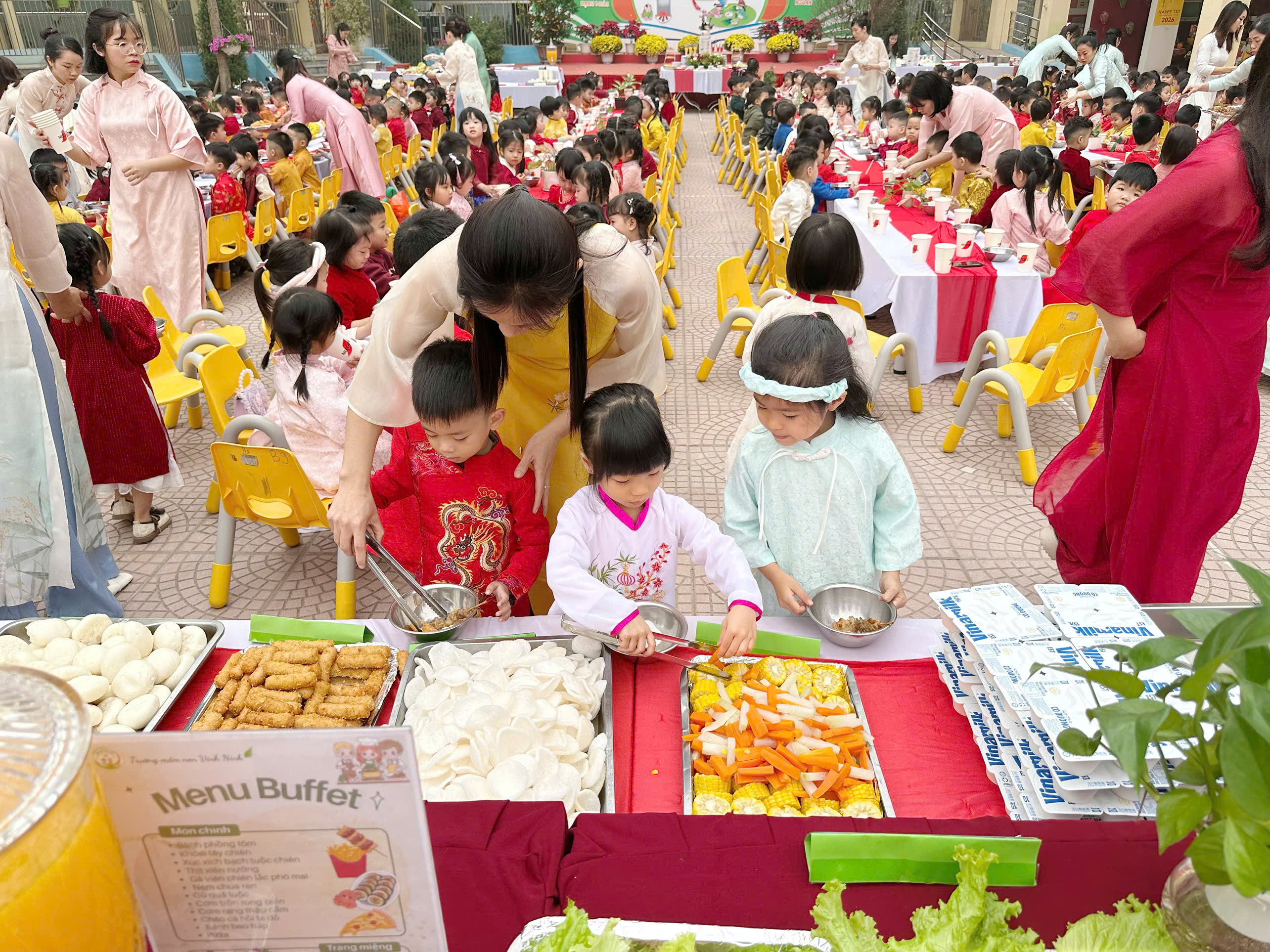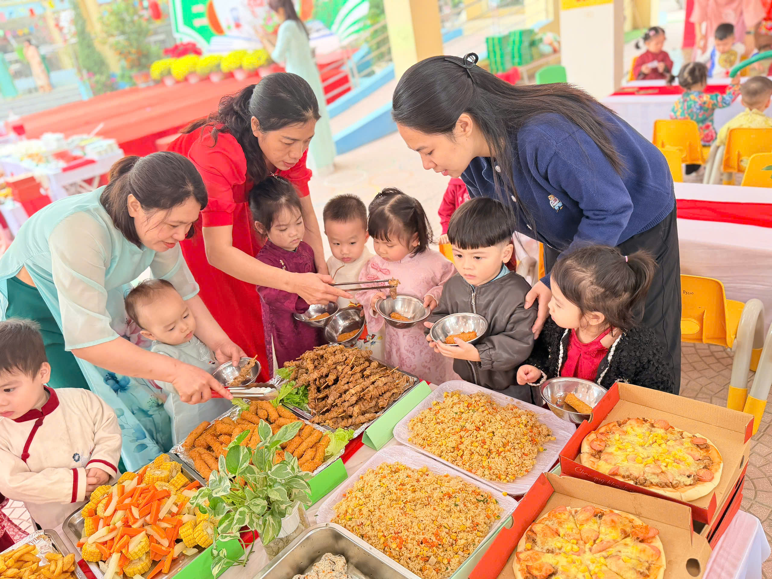 Đại Tiệc Buffet "Vạn Người Mê": Để nạp lại năng lượng sau những giờ "quẩy" nhiệt tình, các bé đã được chiêu đãi một bữa tiệc Buffet đoàn viên siêu thịnh soạn. Nhìn các "thực thần nhí" thưởng thức món ngon một cách ngon lành, các cô giáo và bố mẹ cũng thấy ấm lòng lây!