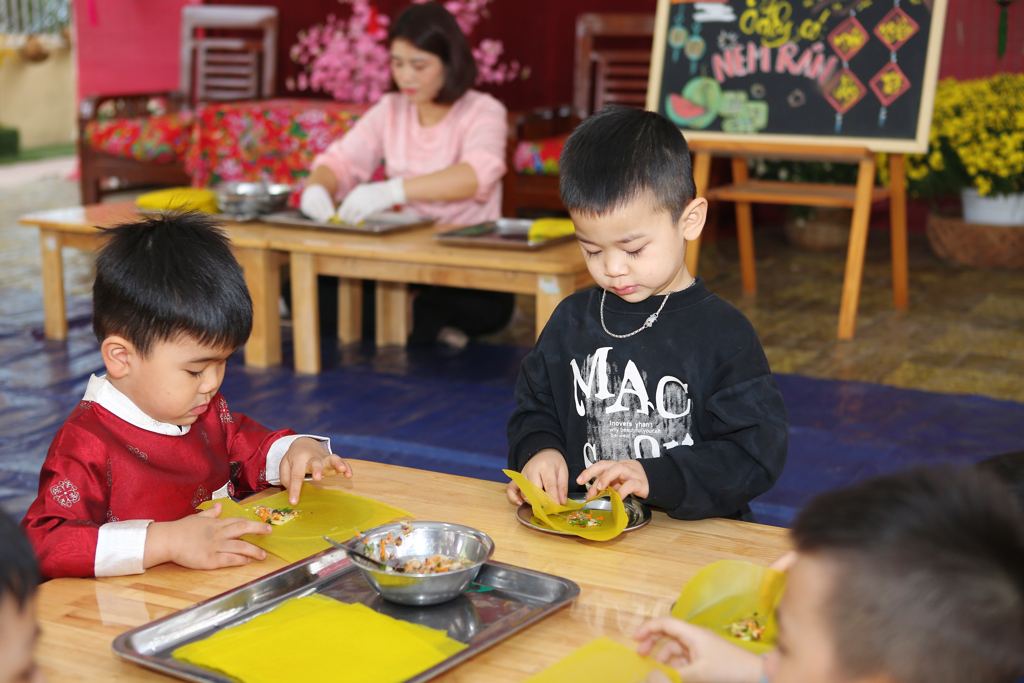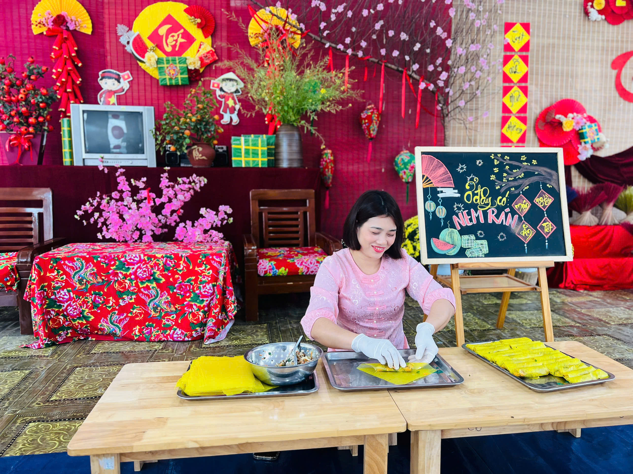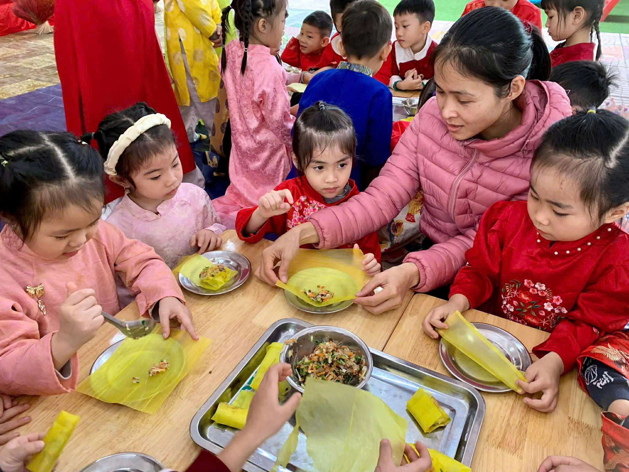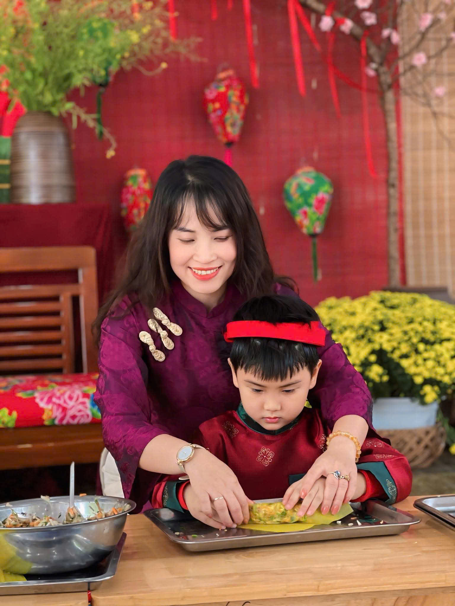Gói bánh chưng, cuốn nem: Đôi tay nhỏ xíu mà cuốn nem, gói bánh thoăn thoắt (dù đôi khi nhân bánh còn... bay ra ngoài một tí nhưng vẫn cực kỳ chất lượng nha bố mẹ ơi!).