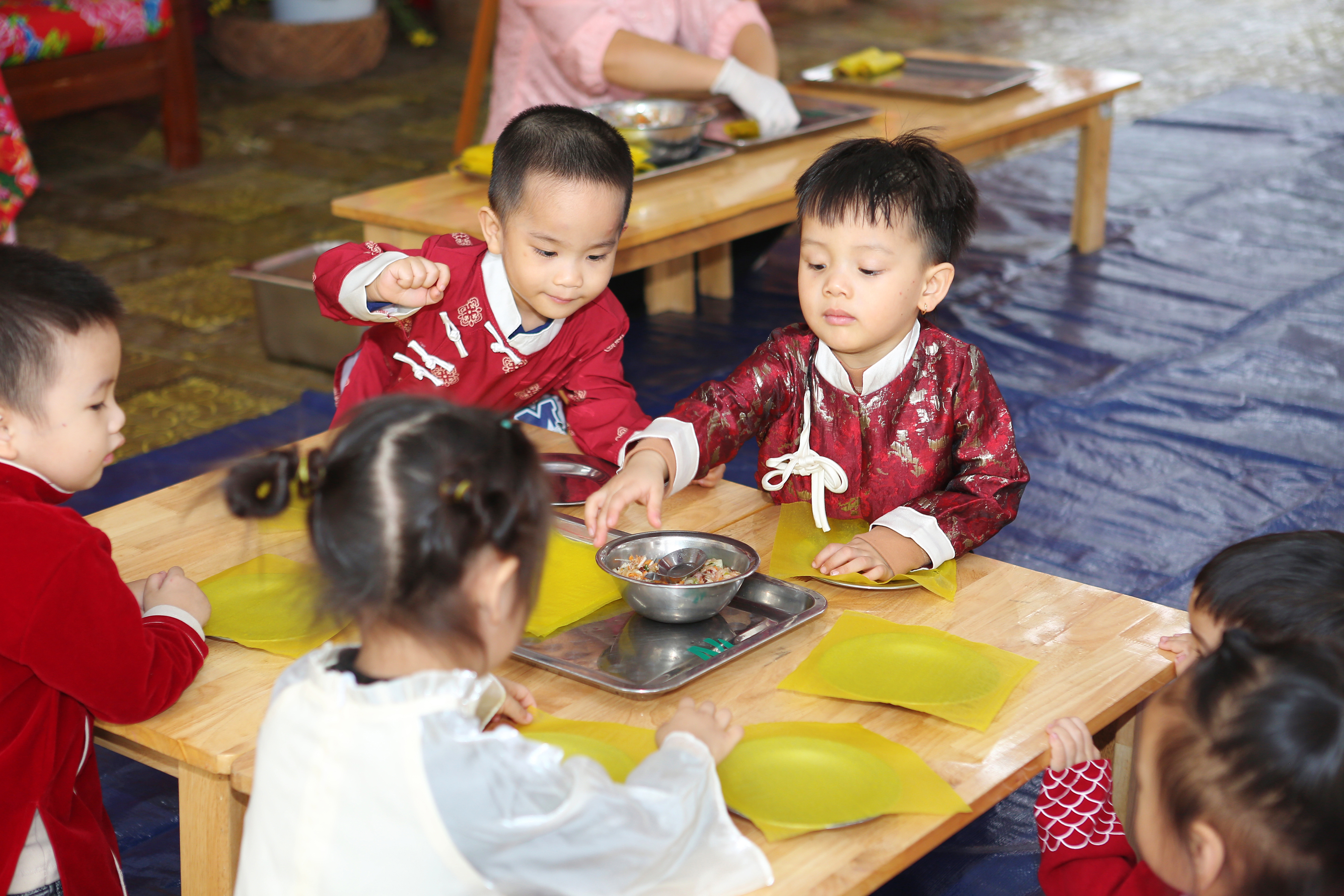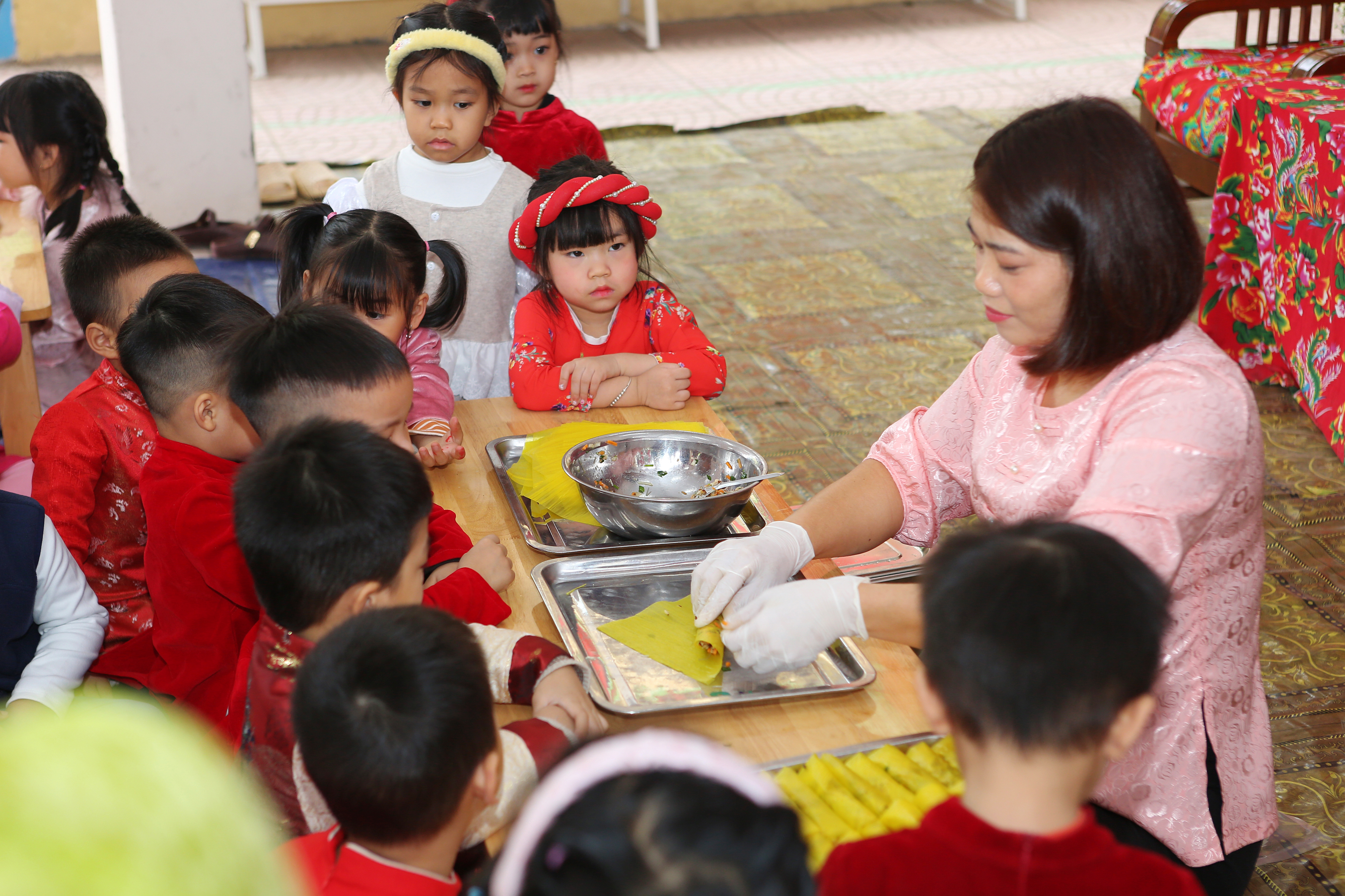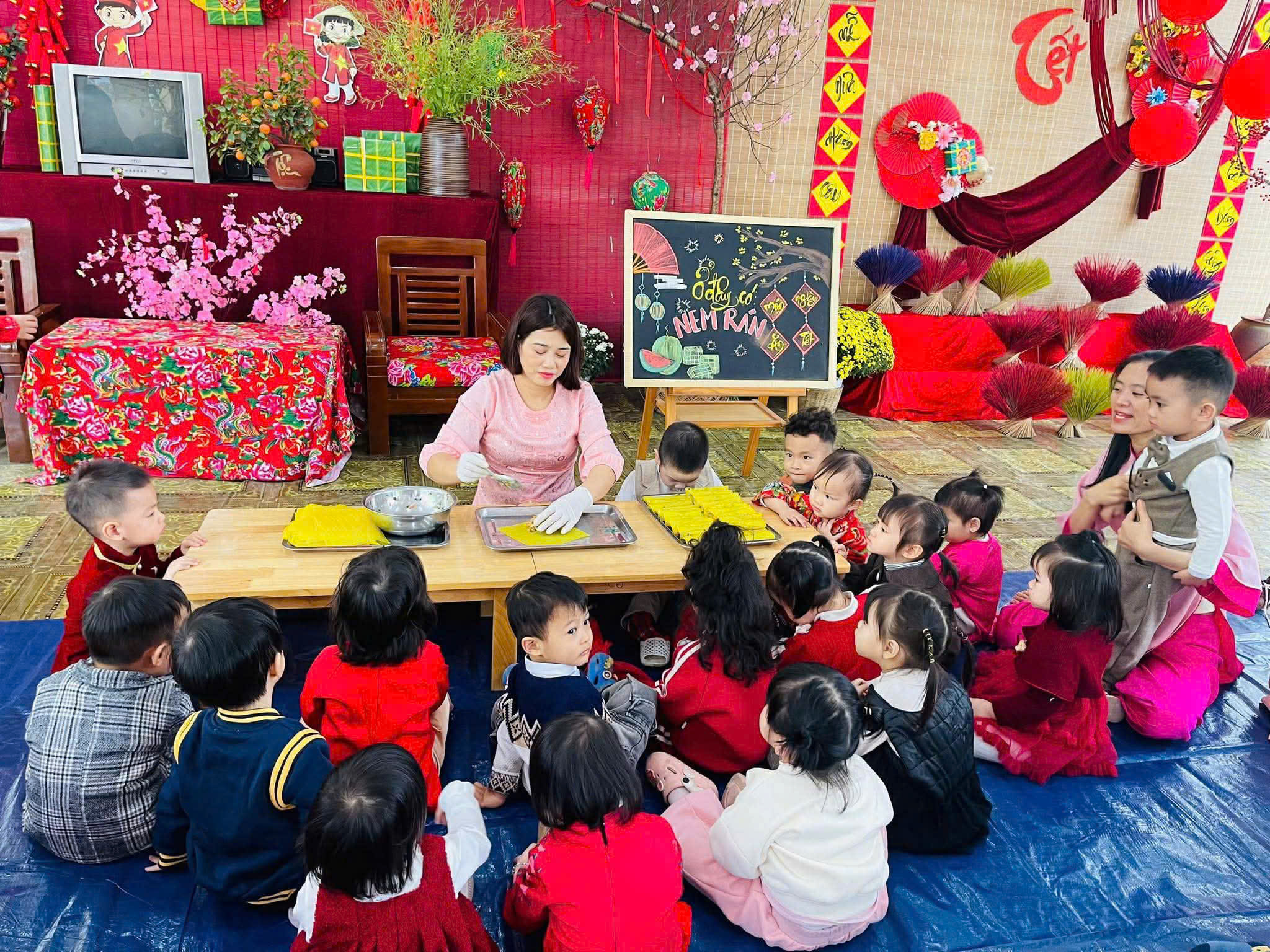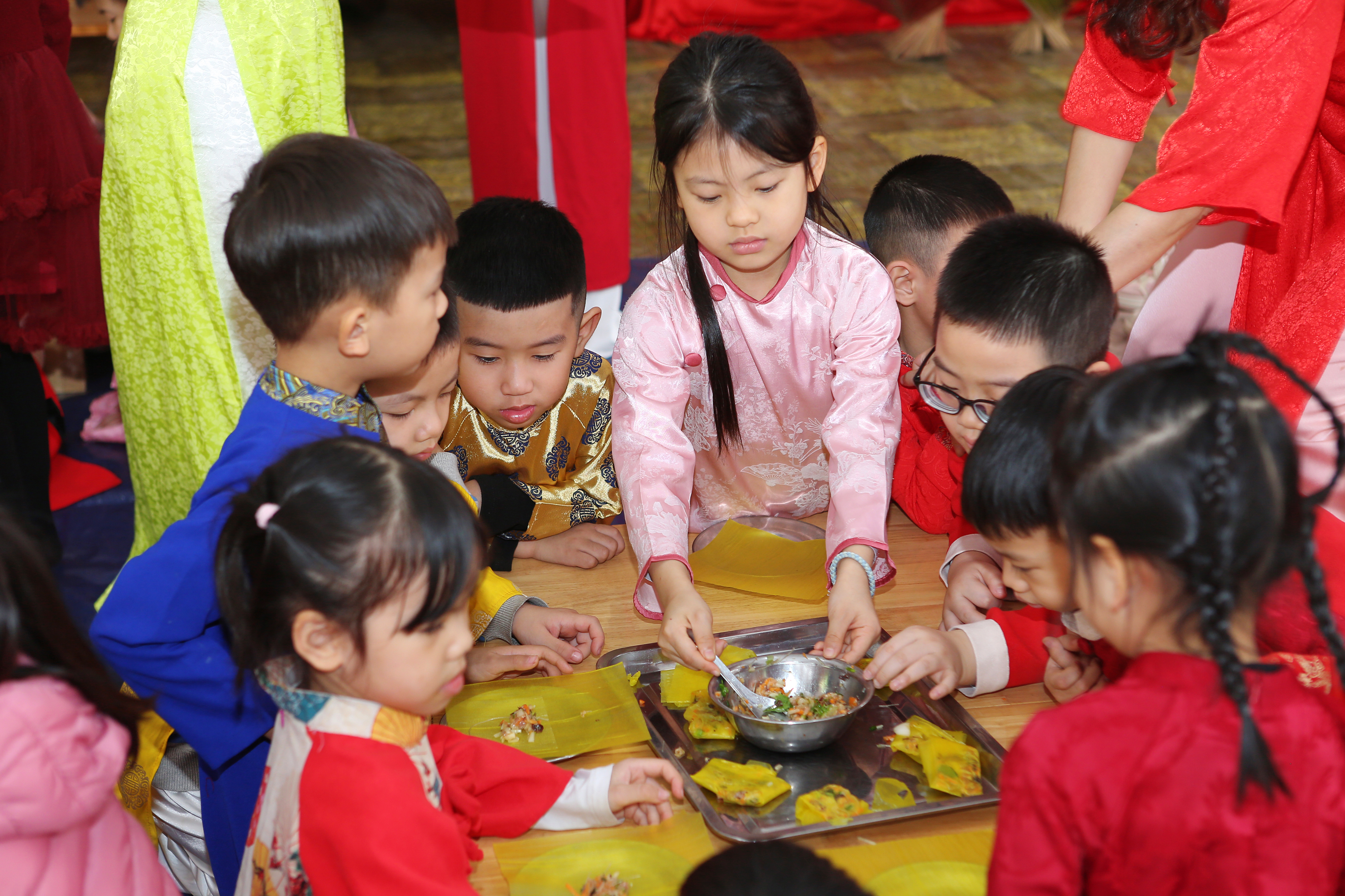 Gói bánh chưng, cuốn nem: Đôi tay nhỏ xíu mà cuốn nem, gói bánh thoăn thoắt (dù đôi khi nhân bánh còn... bay ra ngoài một tí nhưng vẫn cực kỳ chất lượng nha bố mẹ ơi!).