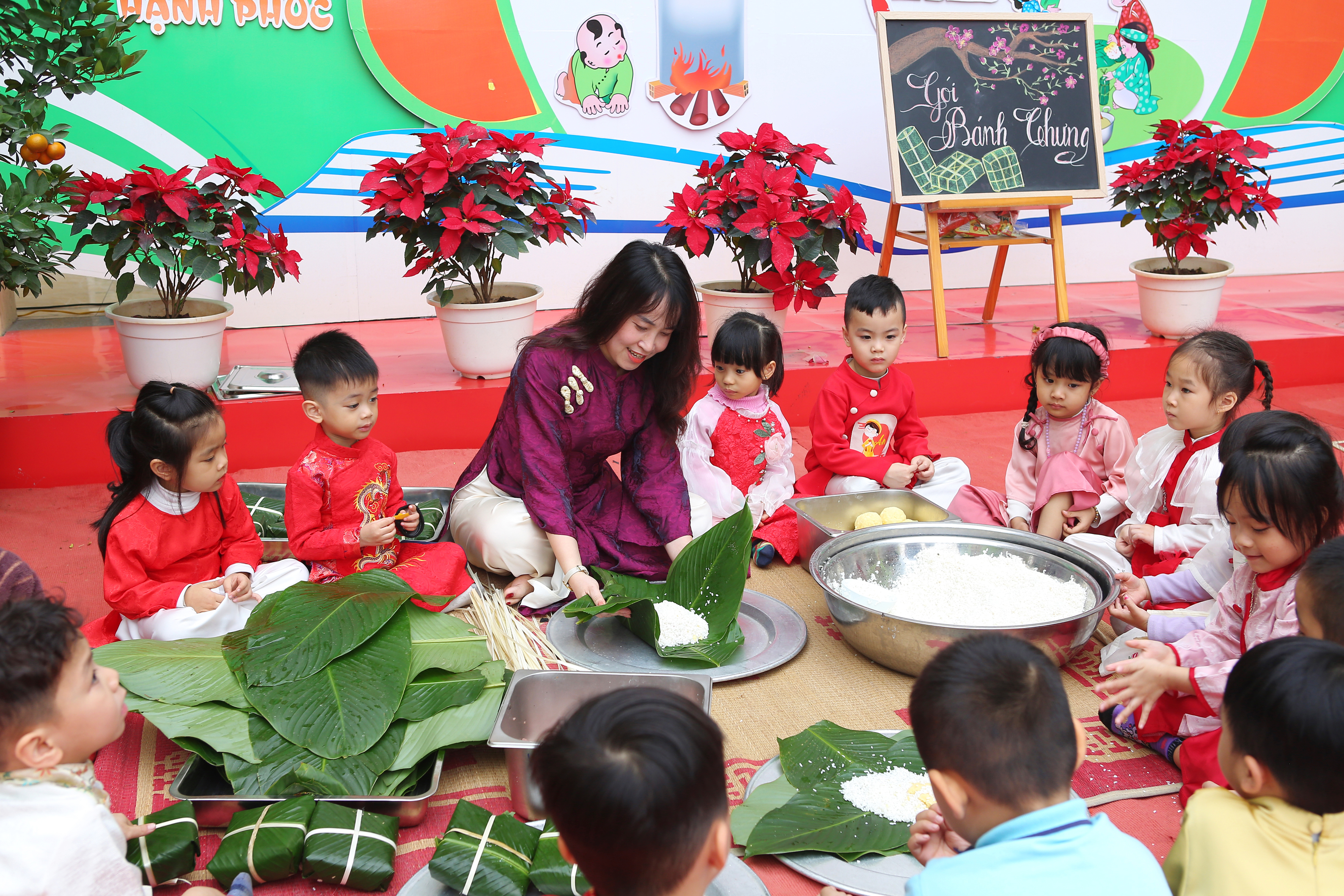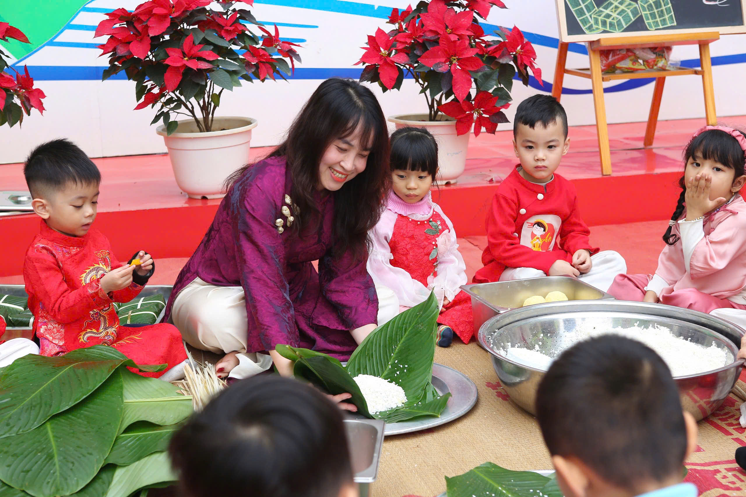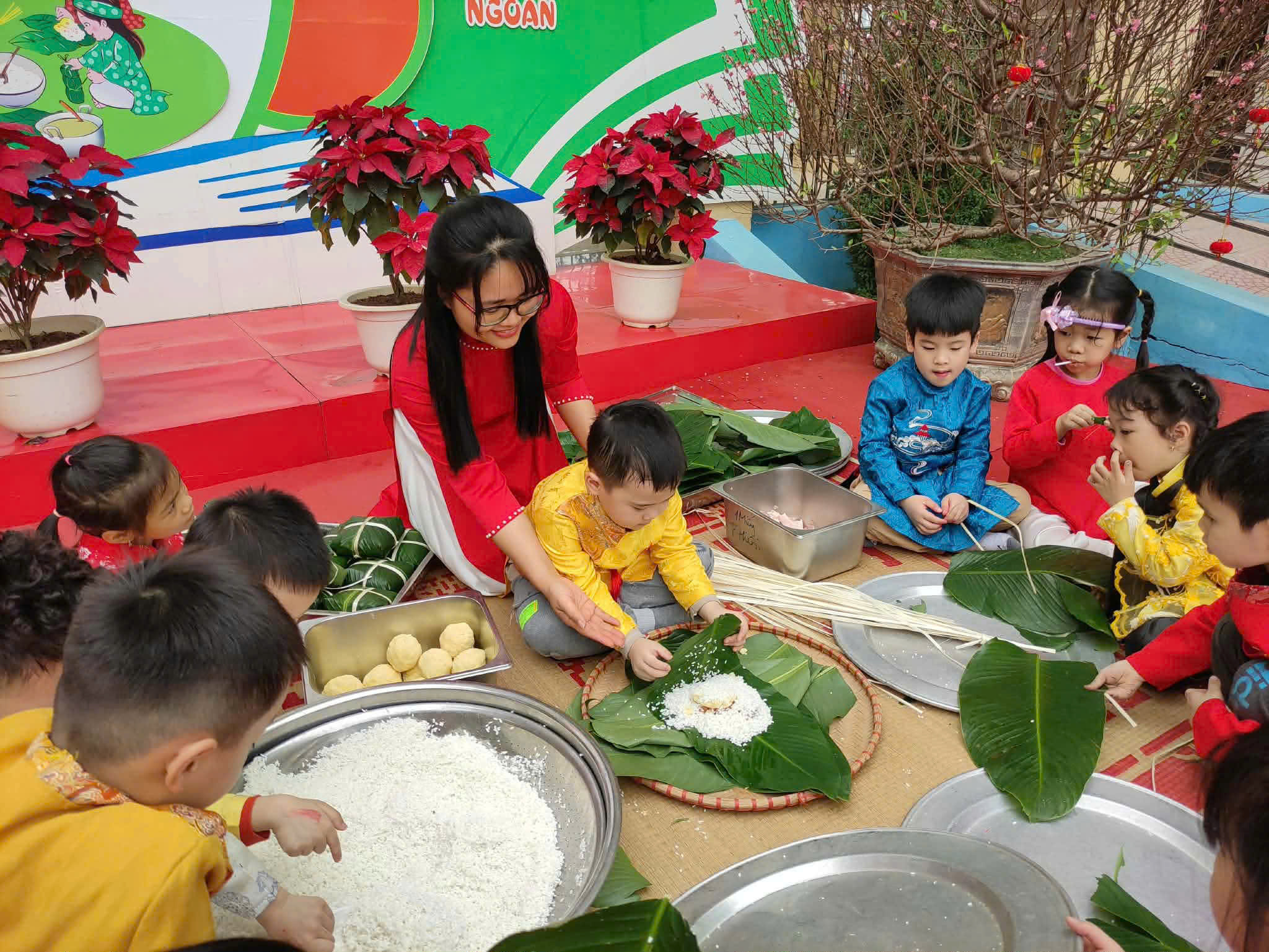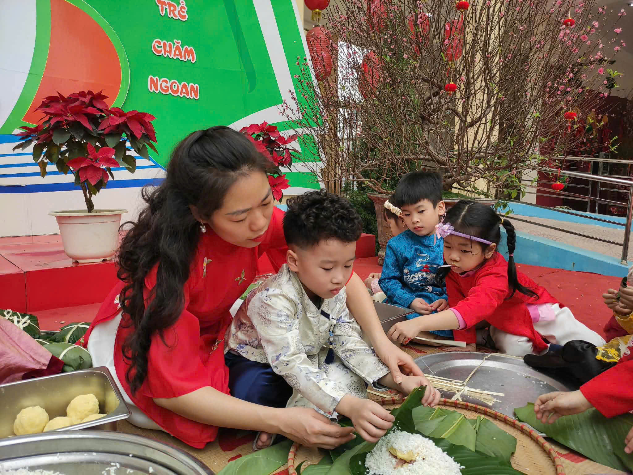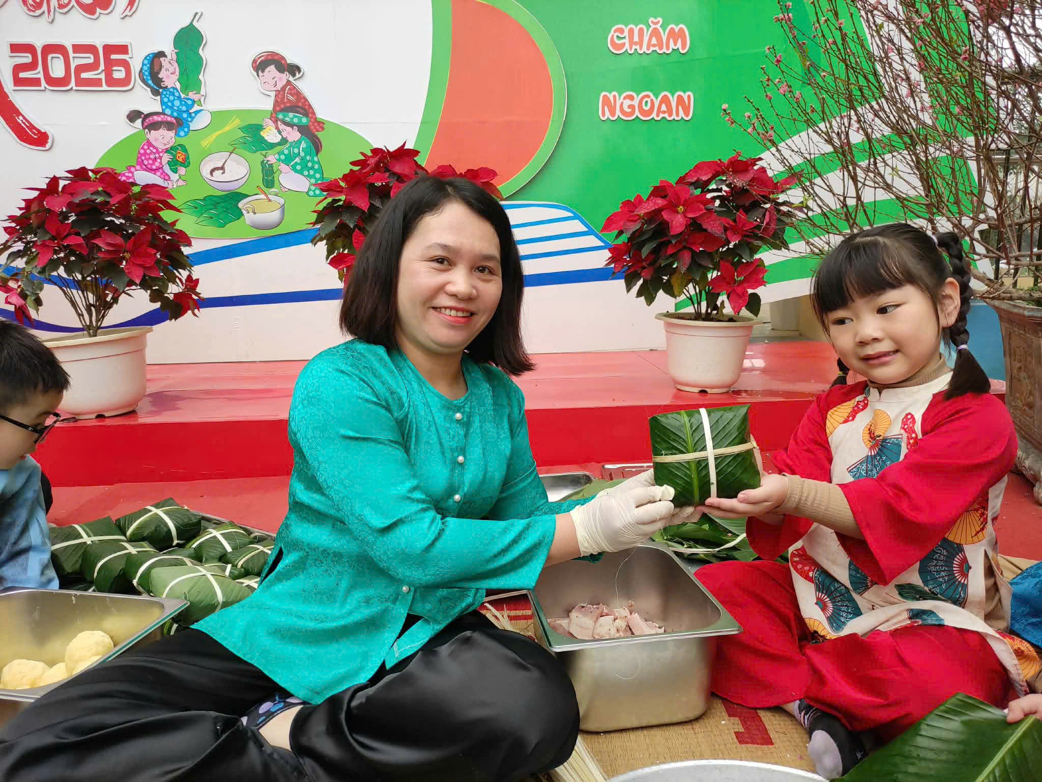 Gói bánh chưng, cuốn nem: Đôi tay nhỏ xíu mà cuốn nem, gói bánh thoăn thoắt (dù đôi khi nhân bánh còn... bay ra ngoài một tí nhưng vẫn cực kỳ chất lượng nha bố mẹ ơi!).