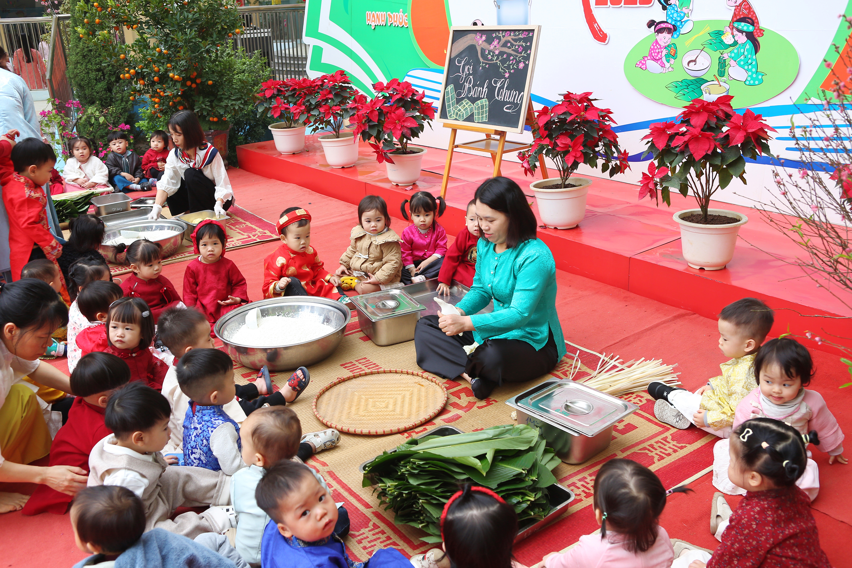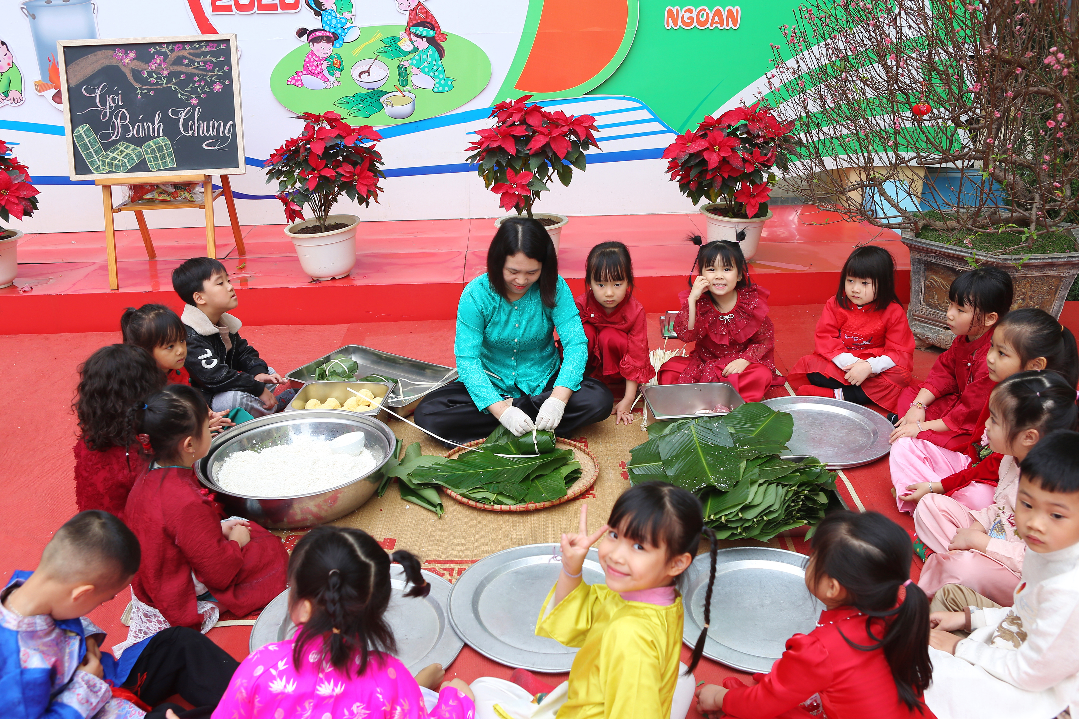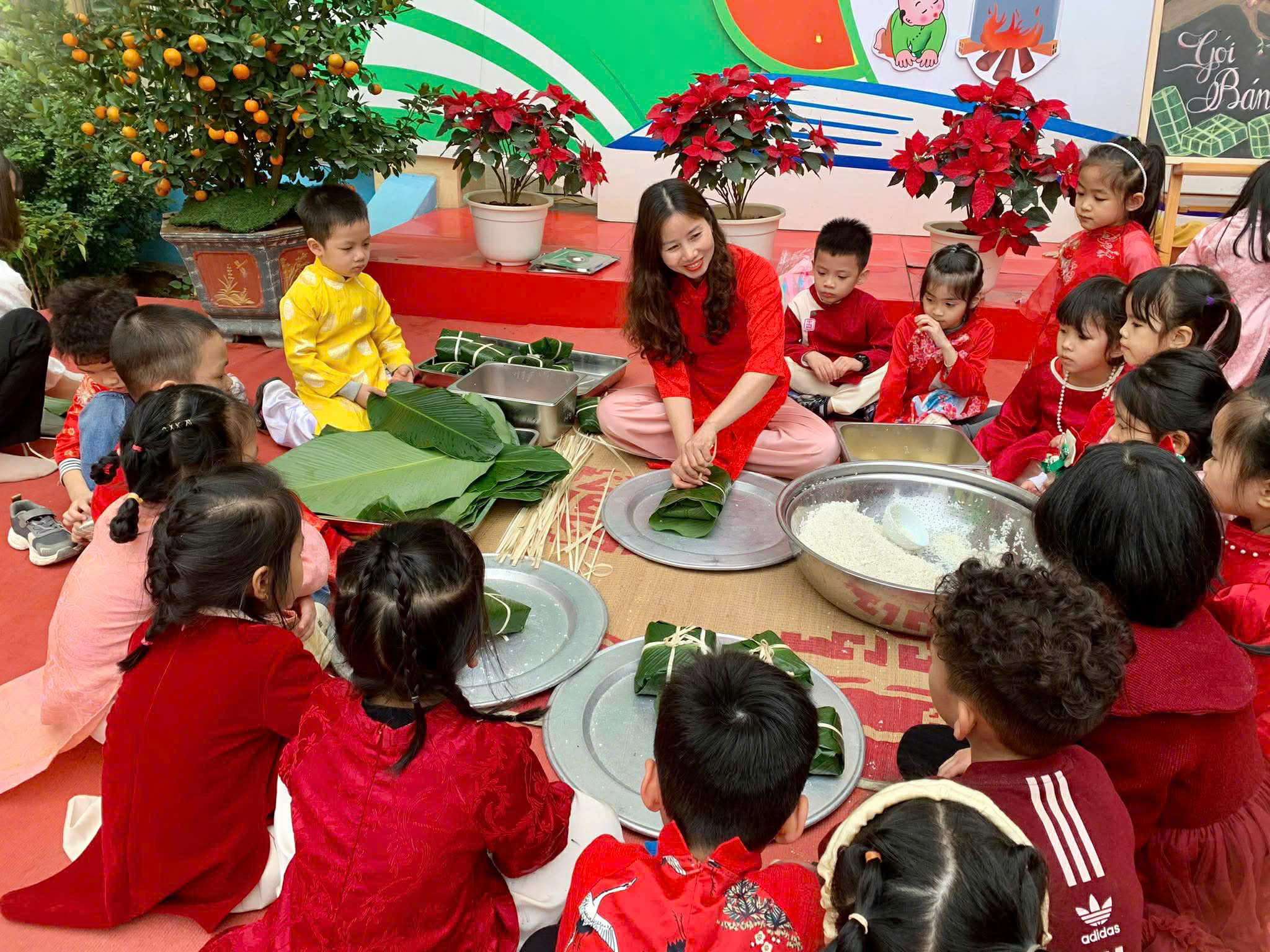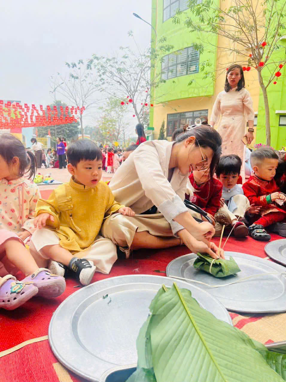 Gói bánh chưng, cuốn nem: Đôi tay nhỏ xíu mà cuốn nem, gói bánh thoăn thoắt (dù đôi khi nhân bánh còn... bay ra ngoài một tí nhưng vẫn cực kỳ chất lượng nha bố mẹ ơi!).