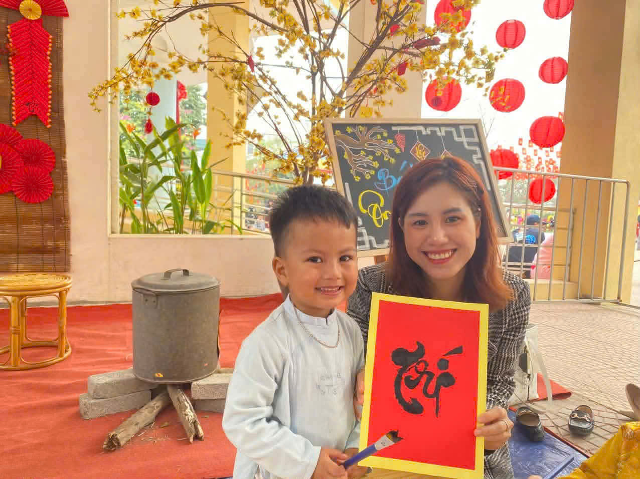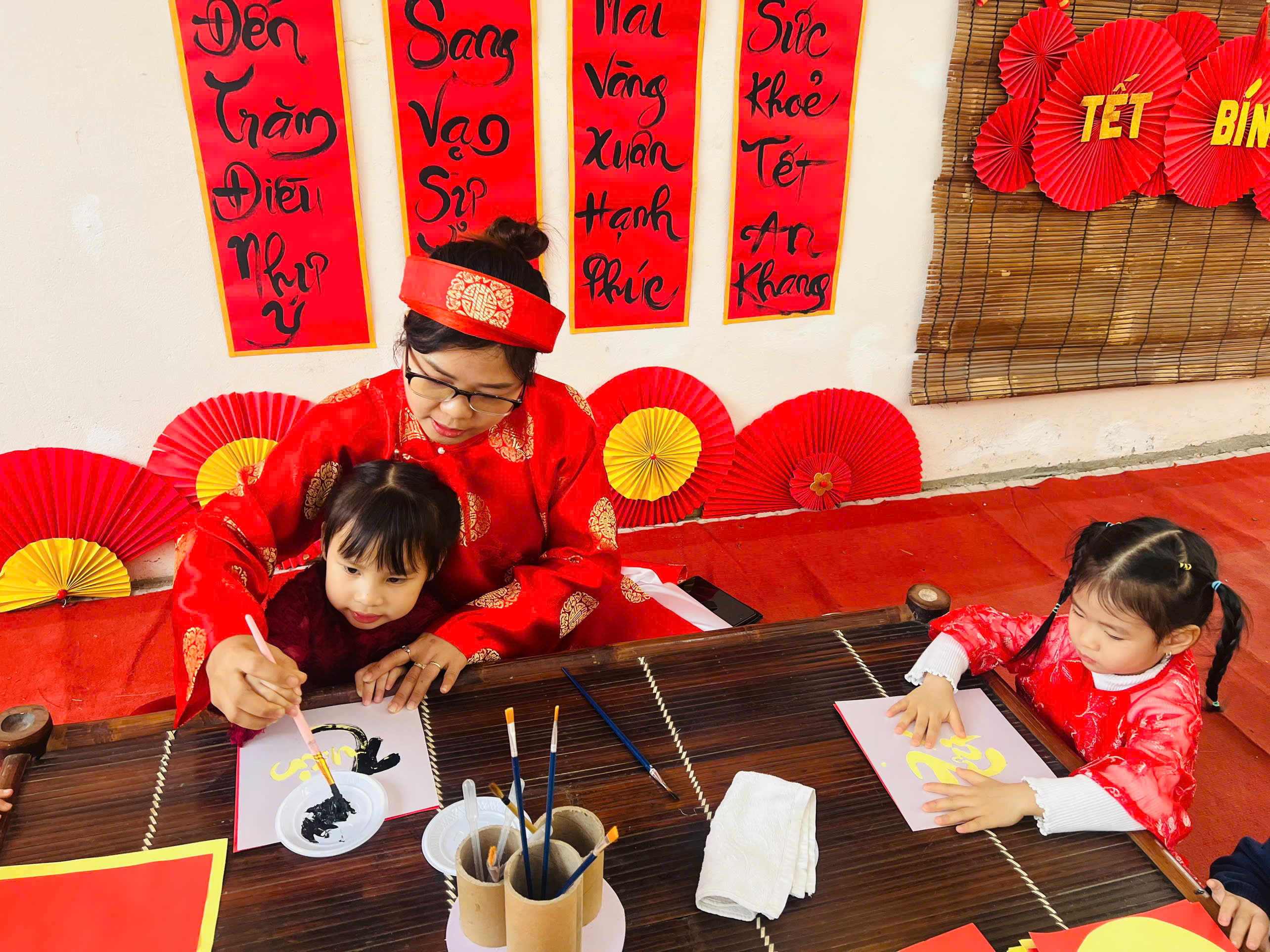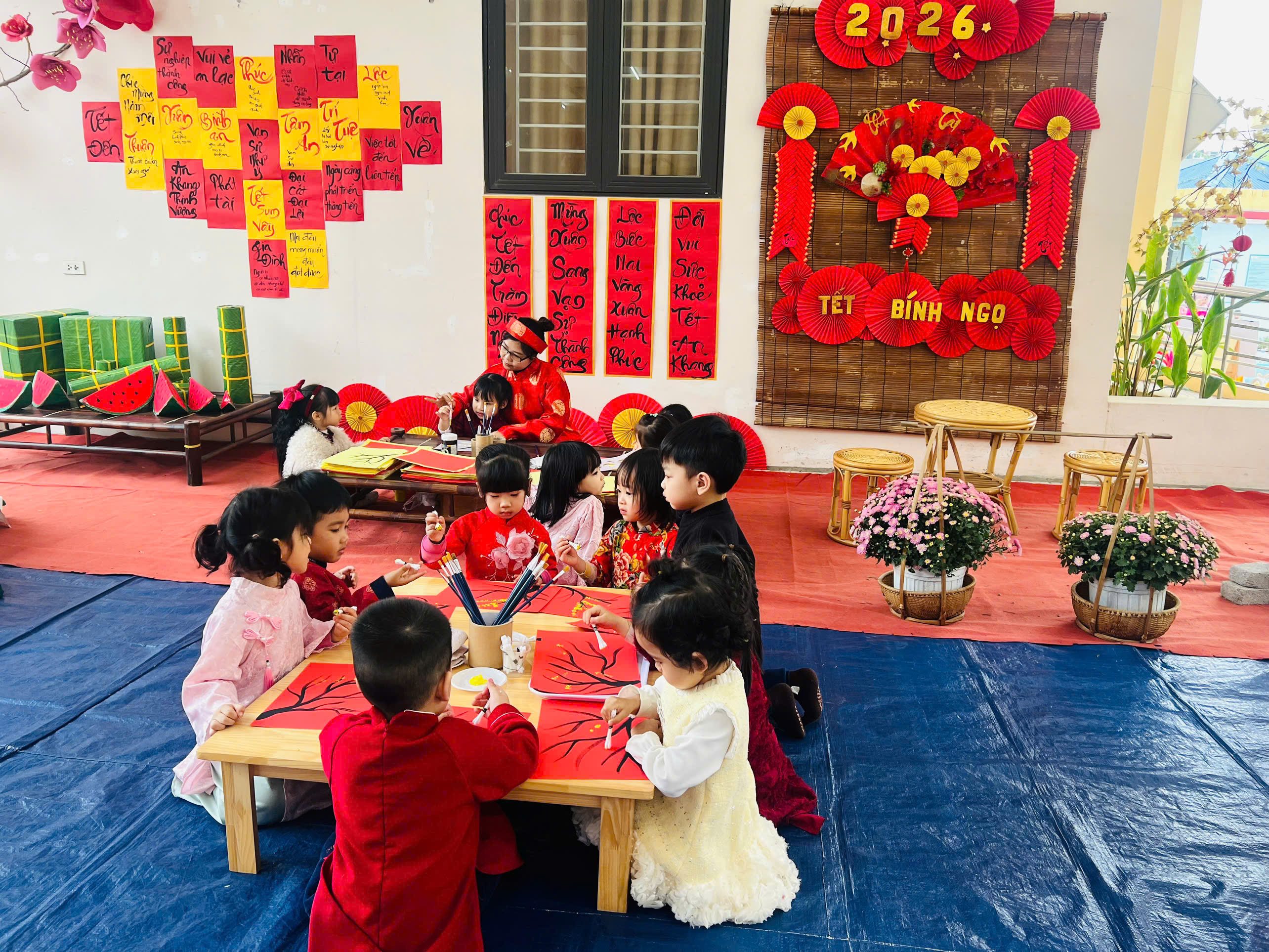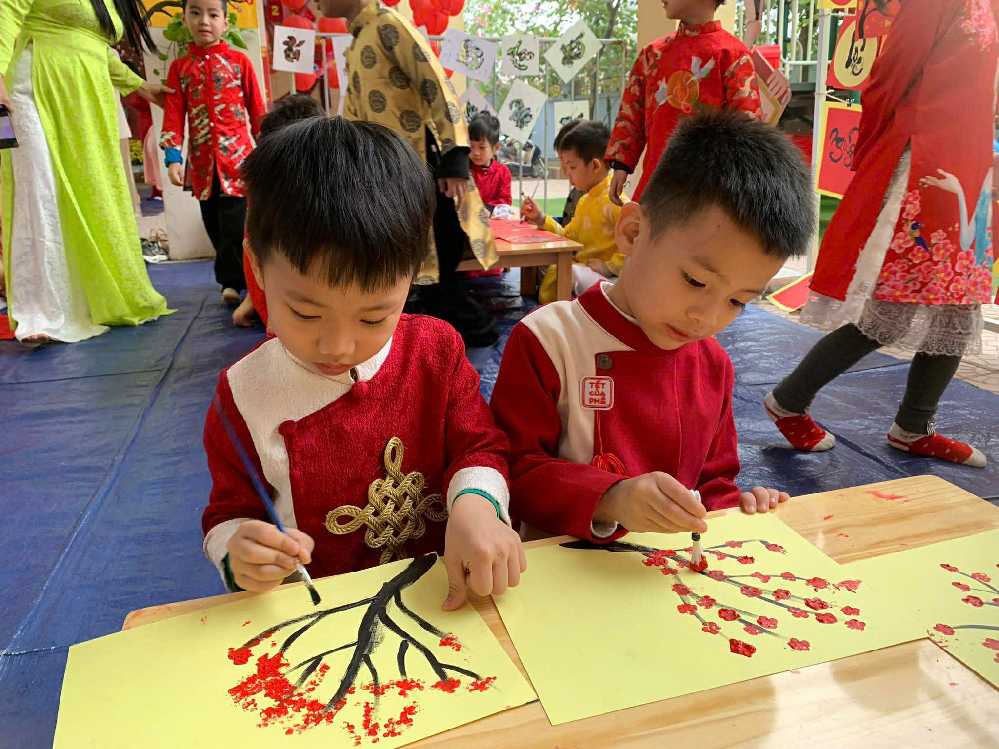 Ông đồ vẽ thư pháp & Làm tranh hoa đào: Những tác phẩm nghệ thuật "để đời" đã ra lò, rực rỡ cả một góc sân trường.