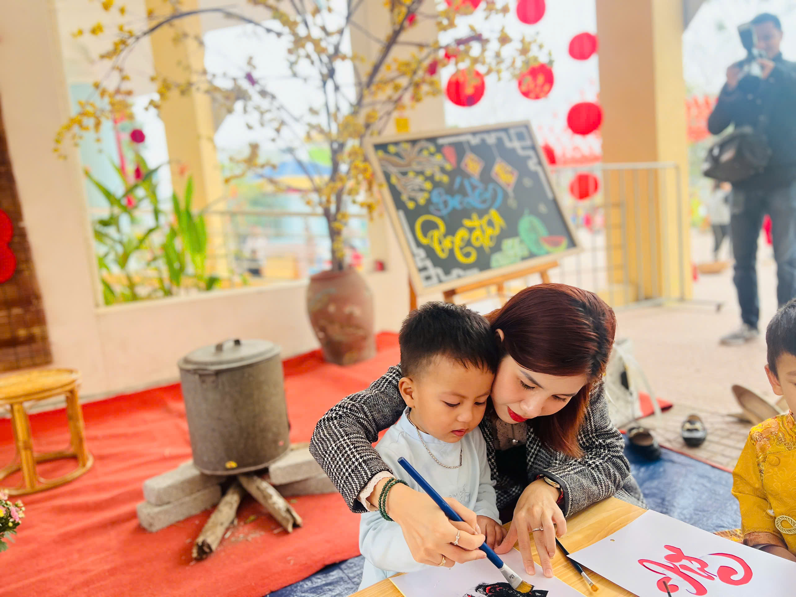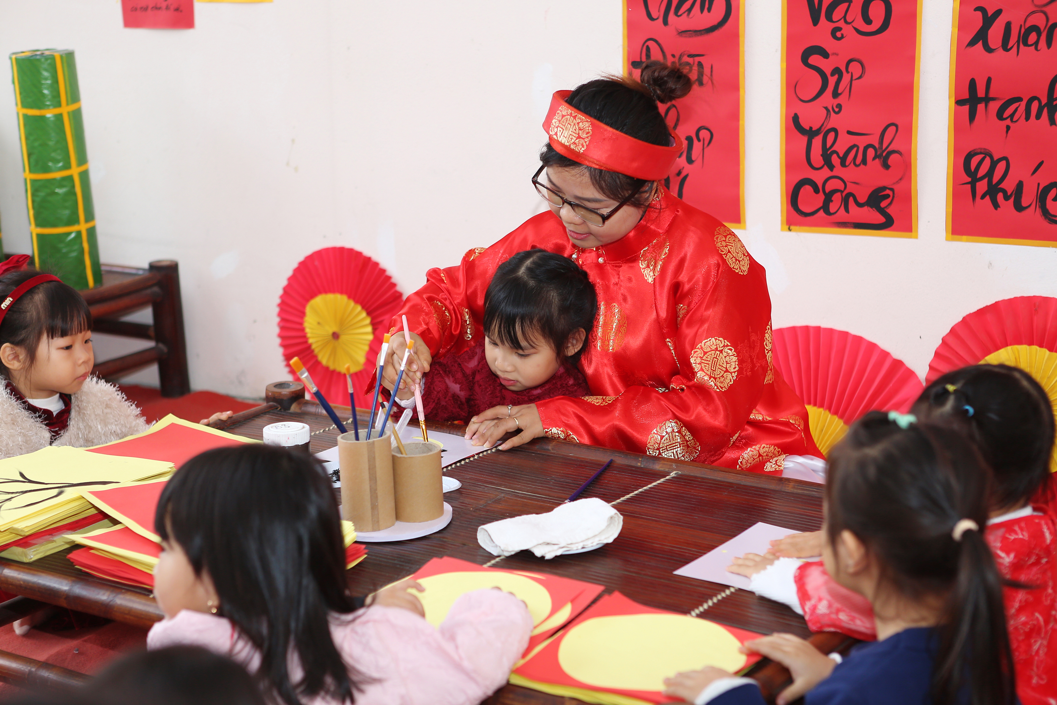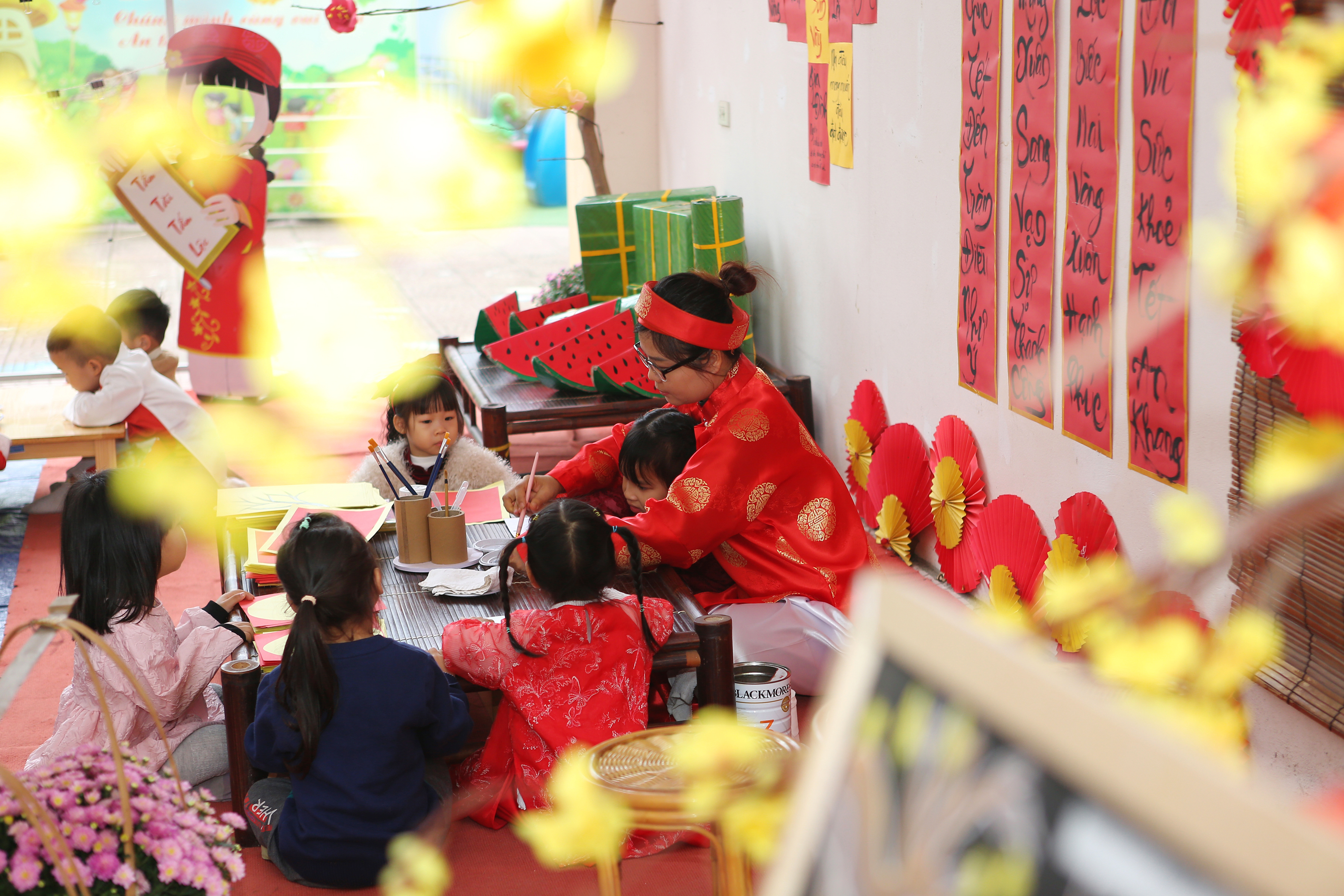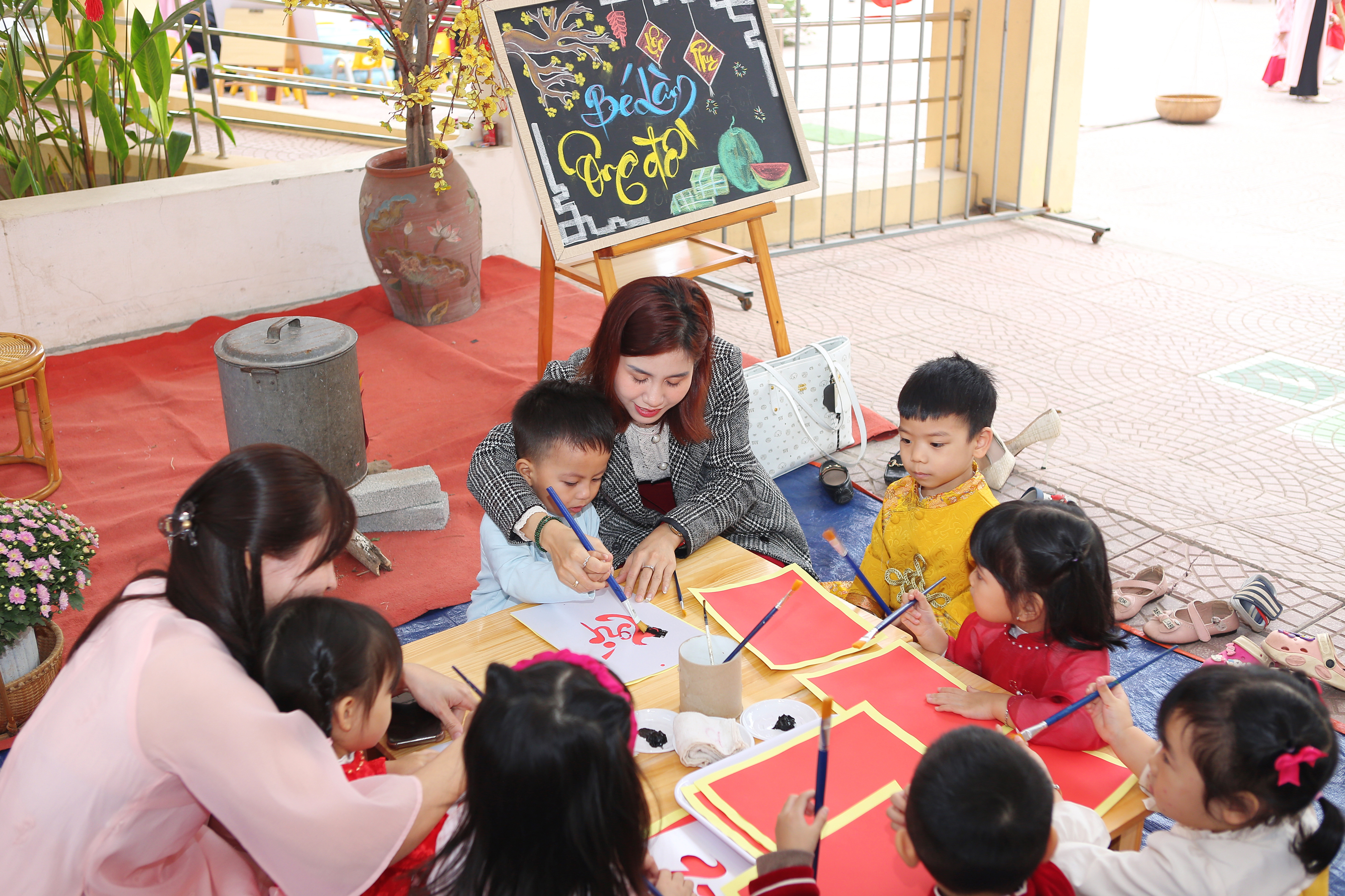 Ông đồ vẽ thư pháp & Làm tranh hoa đào: Những tác phẩm nghệ thuật "để đời" đã ra lò, rực rỡ cả một góc sân trường.